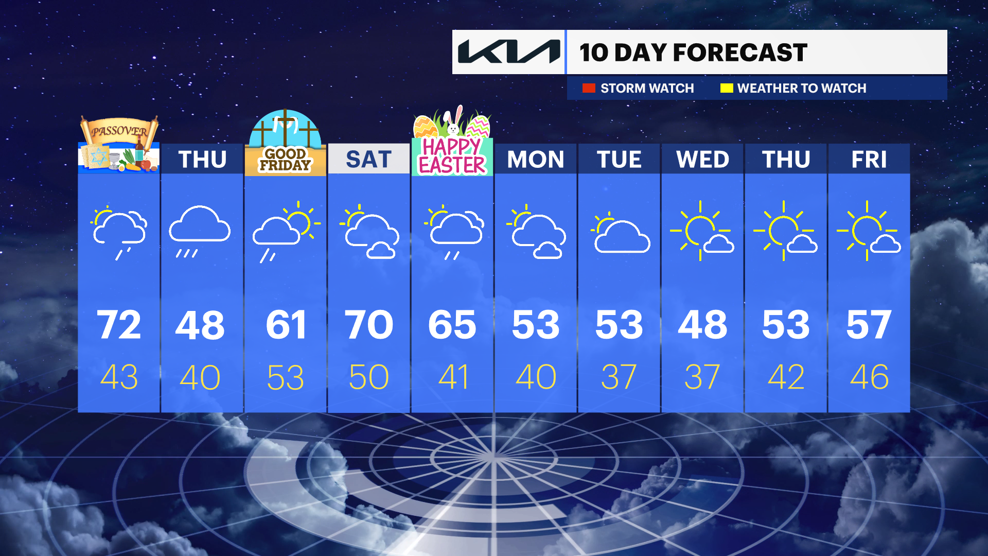 The cold front will return northward as a warm front on Friday, so temperatures will go back up. Showers will also come back. Temperatures will return to the 60s starting Friday and continue through Sunday. Cooler weather slides south again for next week.