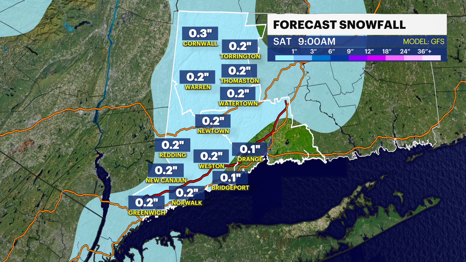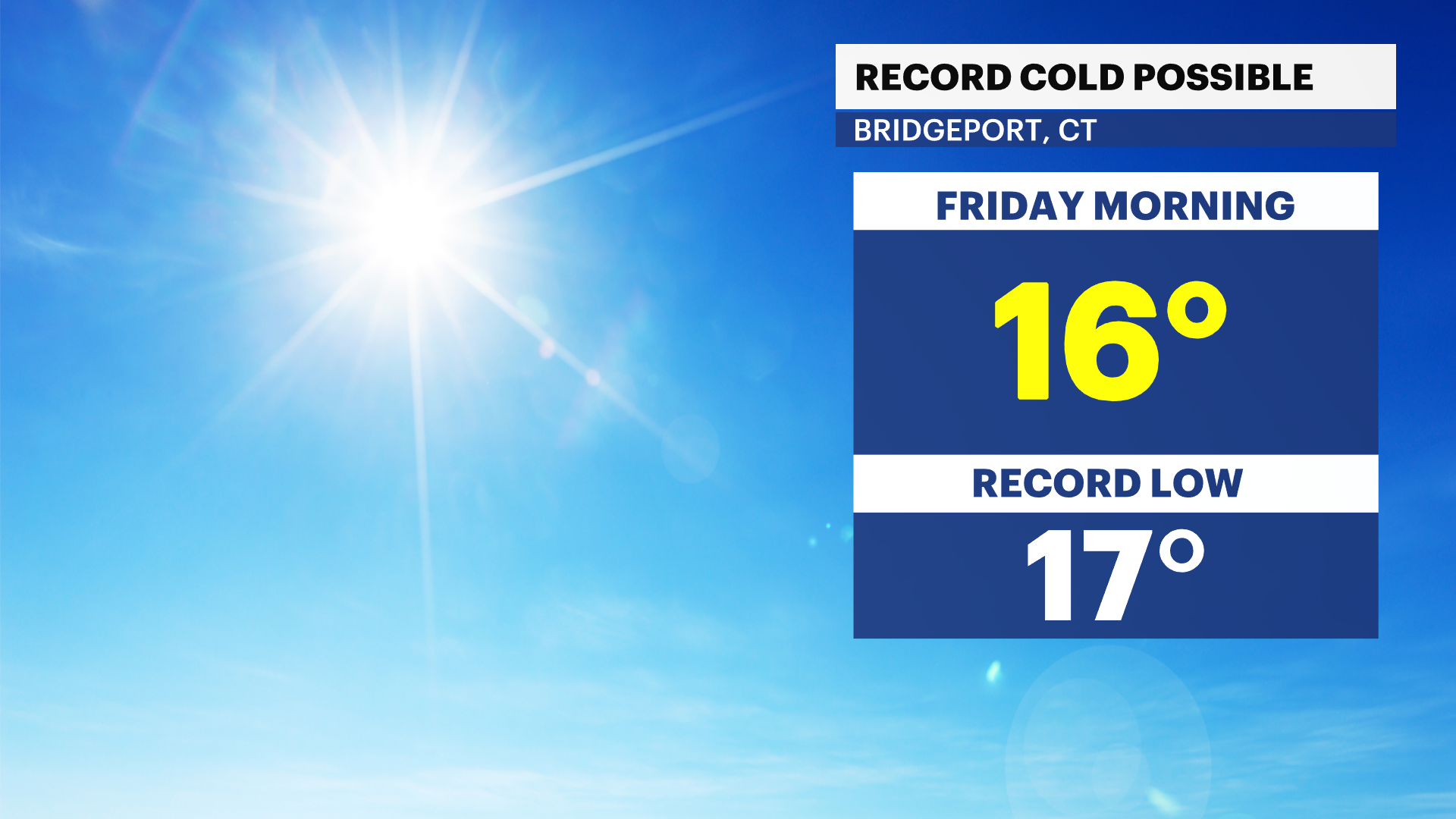 Record cold temperatures are expected on Friday morning. The current record low for December 5 is 17 degrees, our forecast for Bridgeport is 15F. Despite abundant sunshine, temperatures will likely remain below freezing all day on Friday.