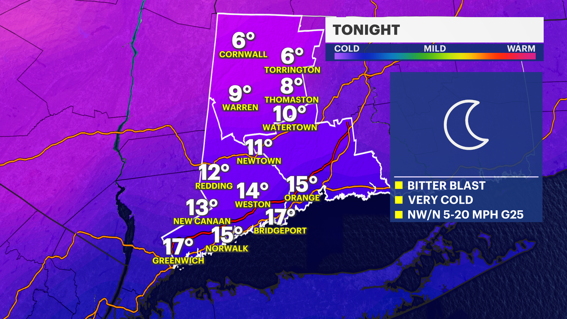 TONIGHT - Bitter Blast: Temperatures will drop into the teens. Calm wind.
