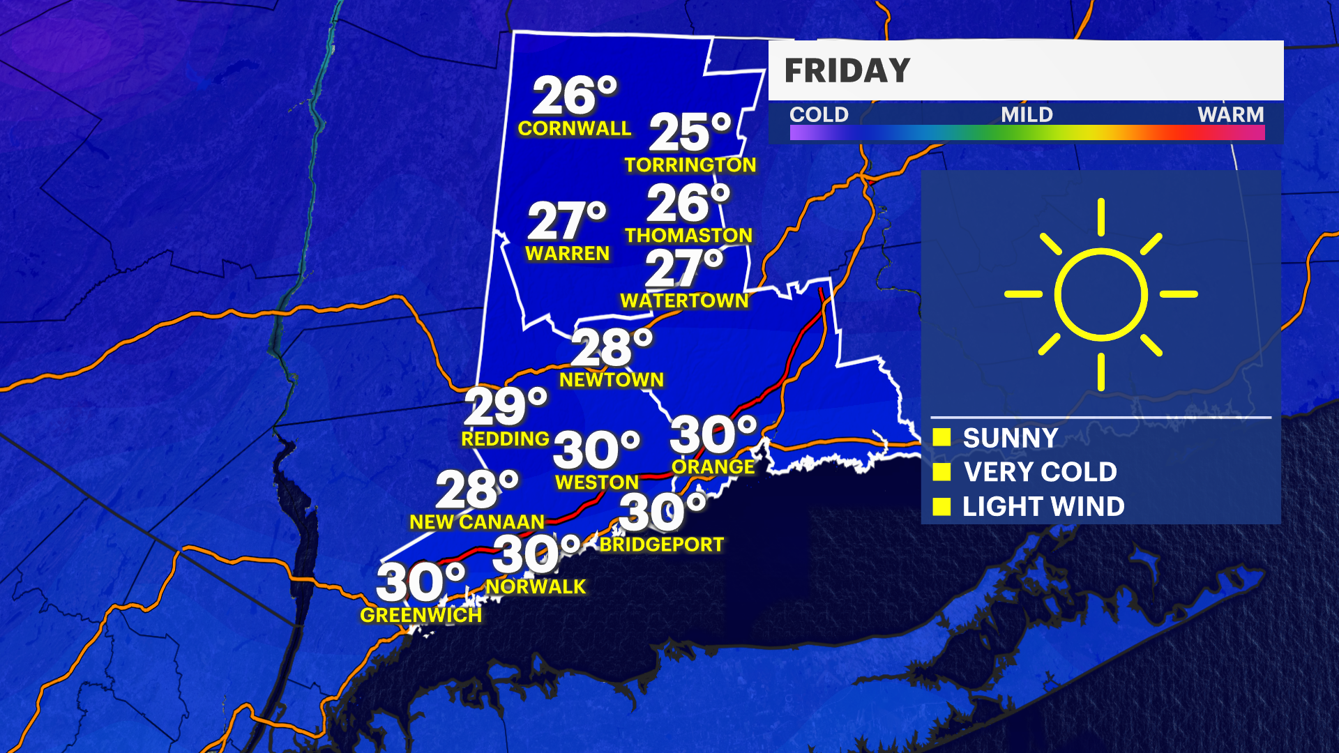 FRIDAY - Bitter Blast: Sun to start, then a few evening clouds. Highs near 30. Light wind.