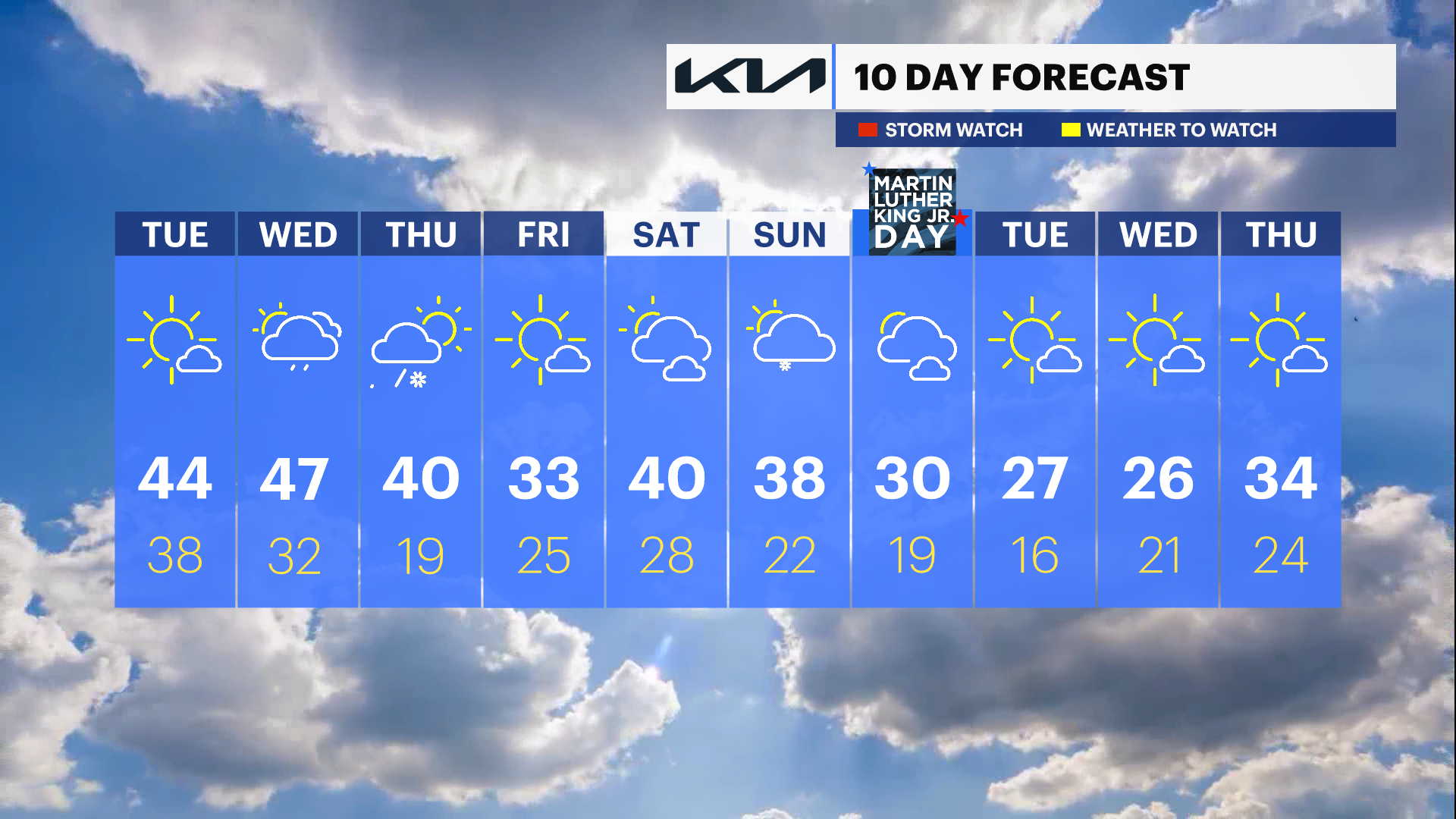The MLK Jr. Day holiday weekend is trending colder, with a few snow showers possible on Sunday. The holiday itself on Monday will feature sun and clouds, with highs struggling to reach 30 degrees.
