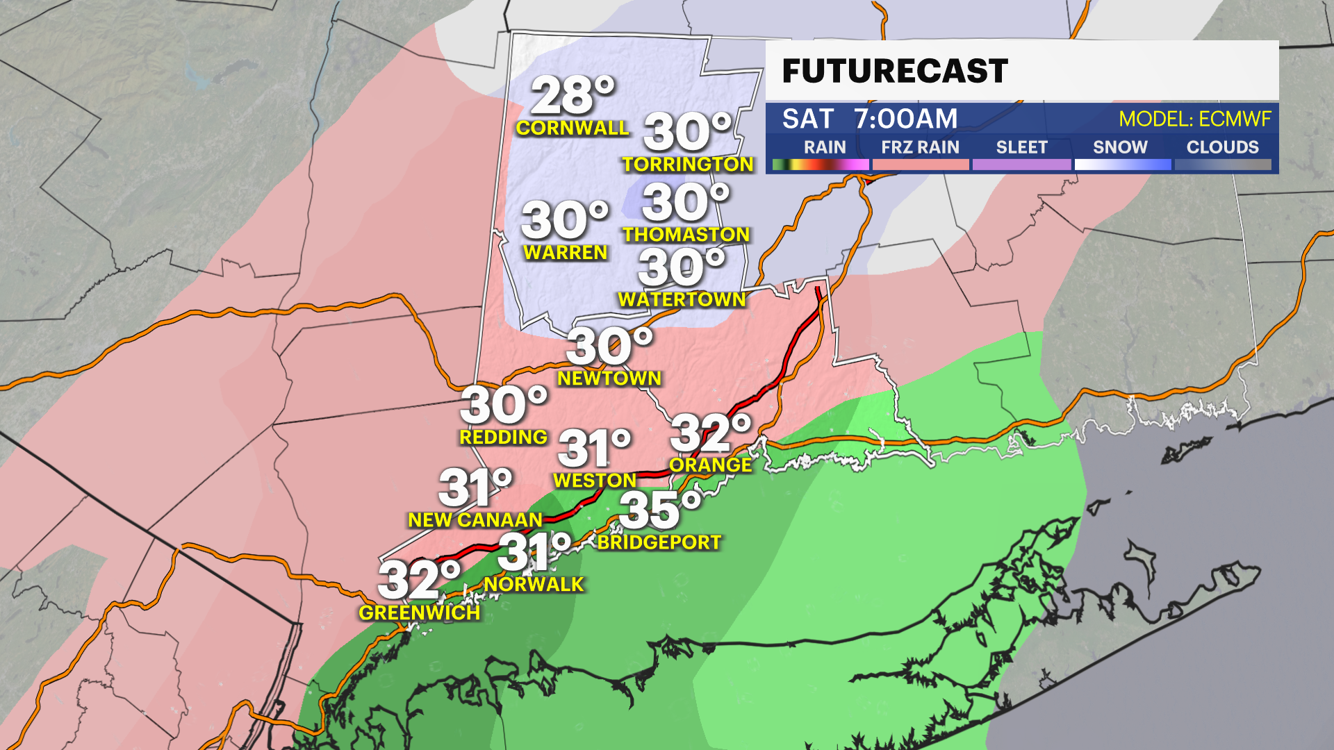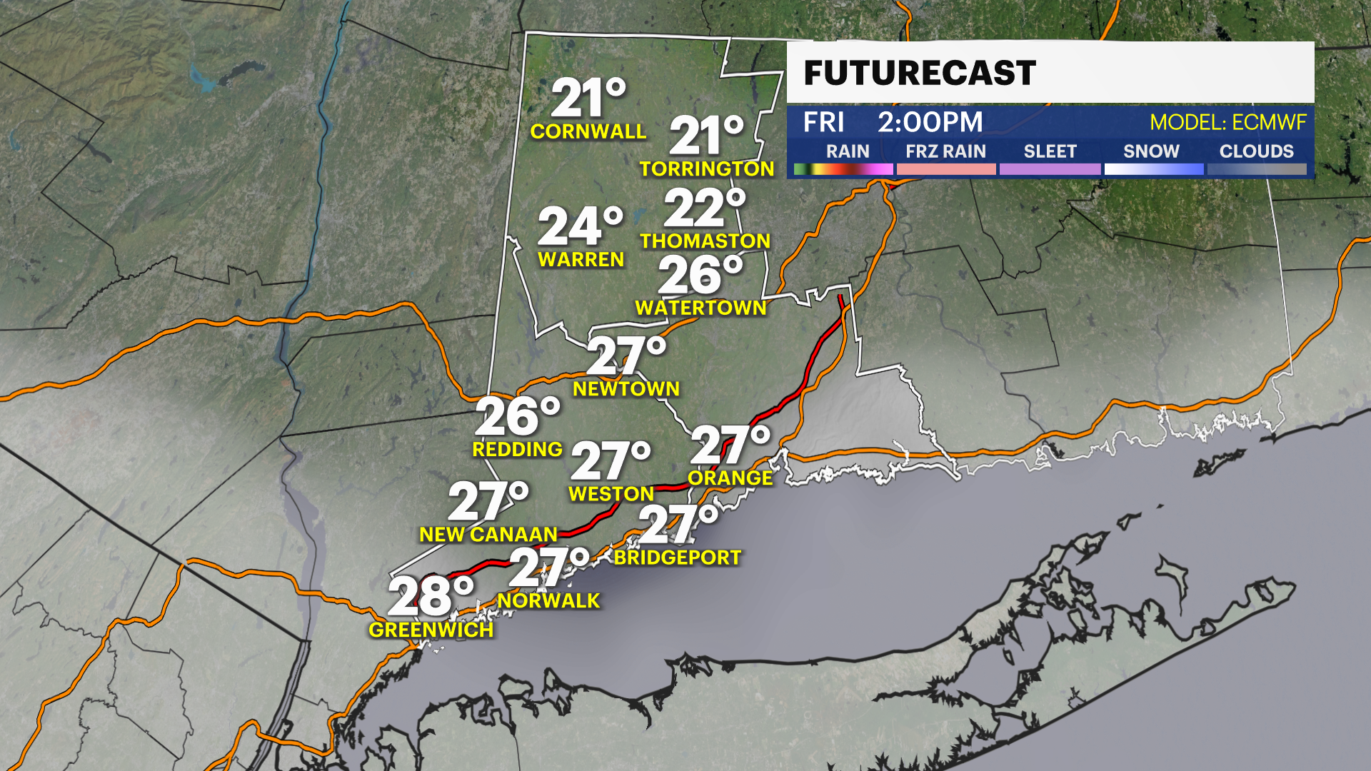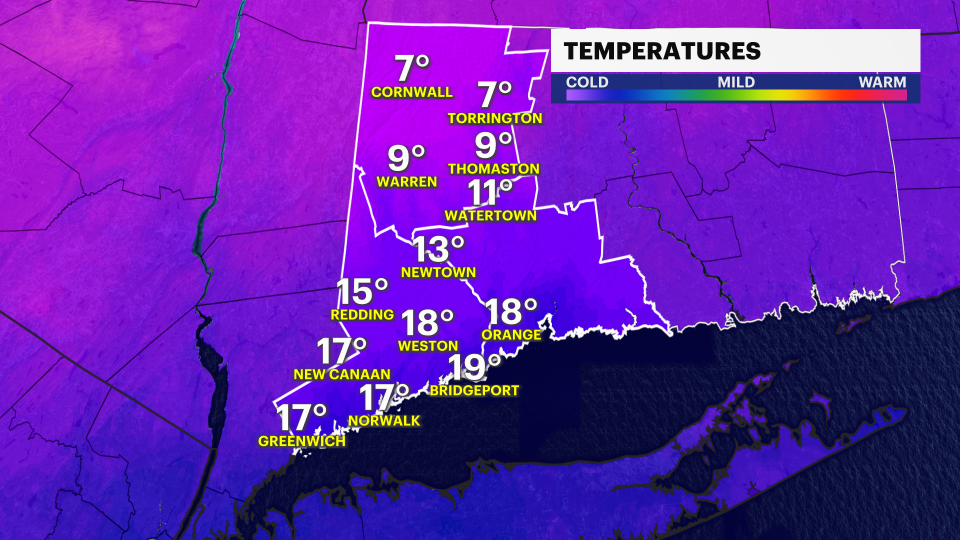 Arctic air has moved over Connecticut overnight. Temperatures this morning are in the teens and single digits farther north and it will feel like the teens and 20s for most of the day. We're tracking a few rain or snow showers for Saturday morning. The next bitter blast will arrive Monday into Tuesday. There is no break from the cold in sight, but there's also no major storms for the upcoming week. Here's a day-by-day breakdown of the forecast.