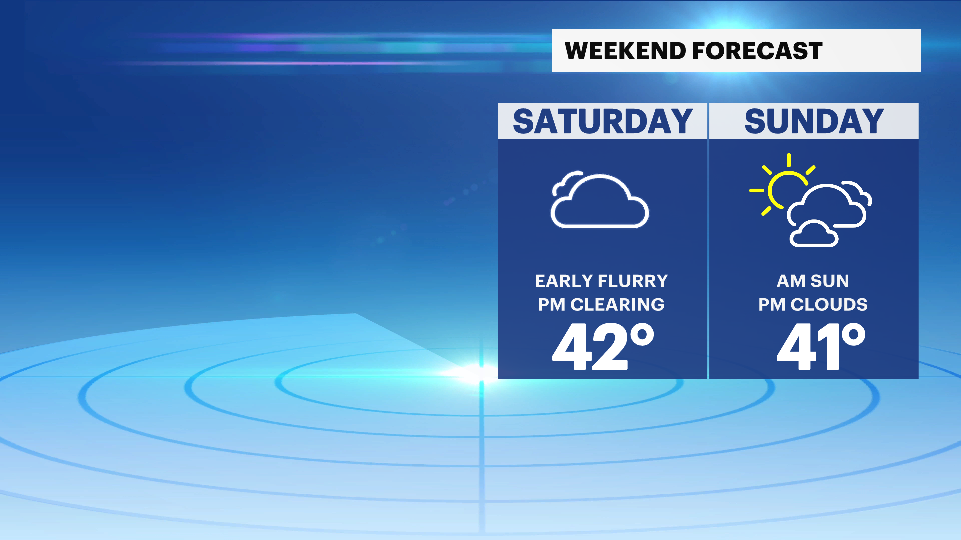 Saturday -Overcast for most of the day with a stray flurry north or sprinkle south. Highs near 40, but it feels like the 30s.