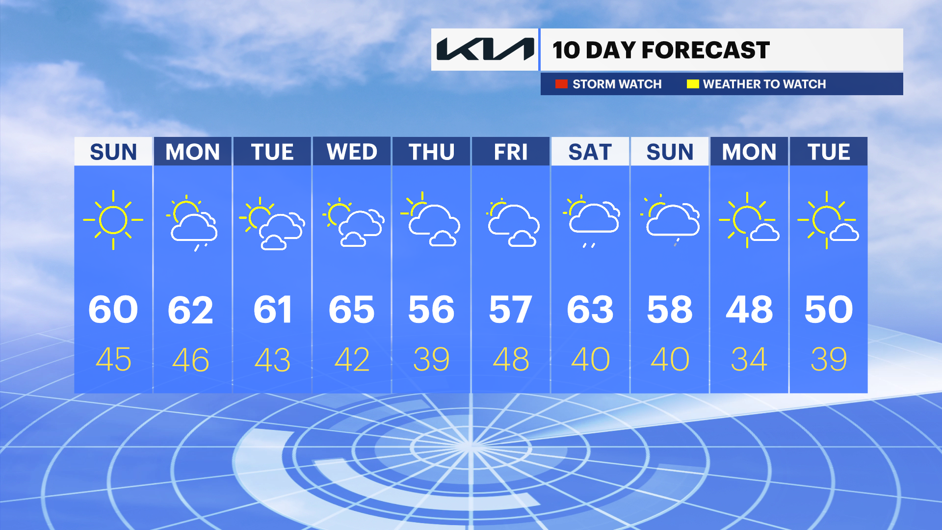 MONDAY: Mostly cloudy, late showers. High 60.
