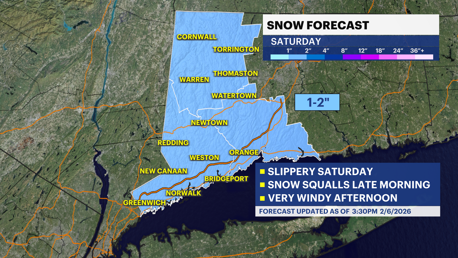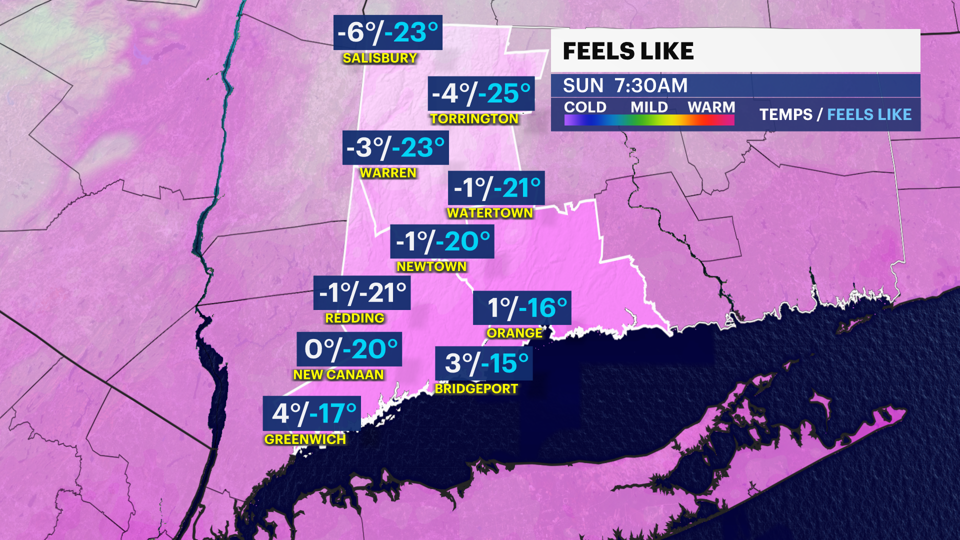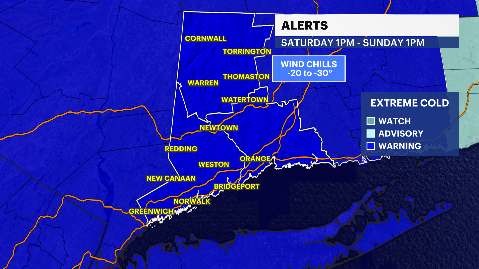 An extreme cold warning will be in effect for Connecticut from Saturday 1 p.m. to Sunday 1 p.m. Wind chills will be -15 to as low as -30. At that rate, frostbite can happen in just 30 minutes.