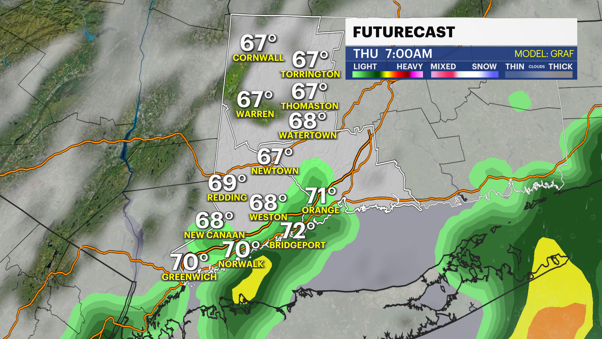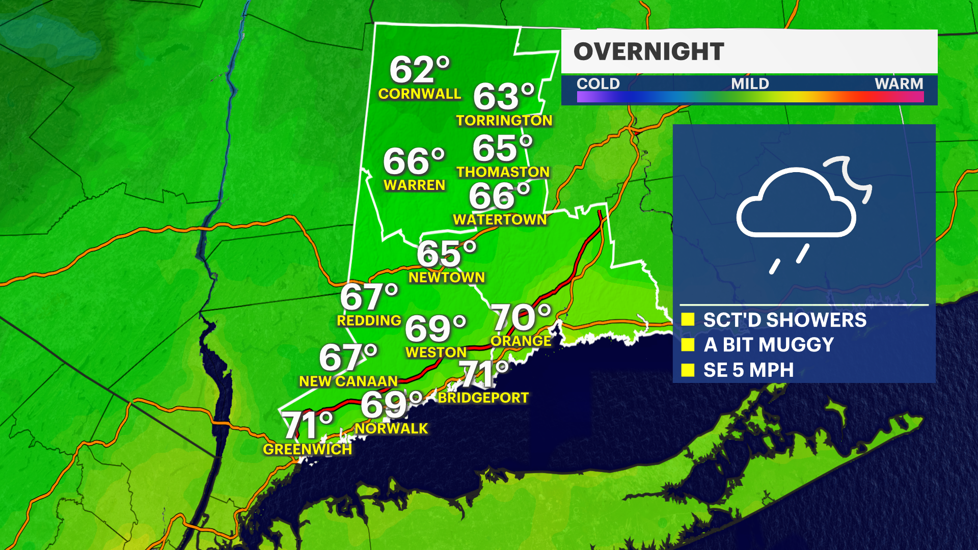 OVERNIGHT: Mostly cloudy and muggy with scattered showers possible. Low of 70.