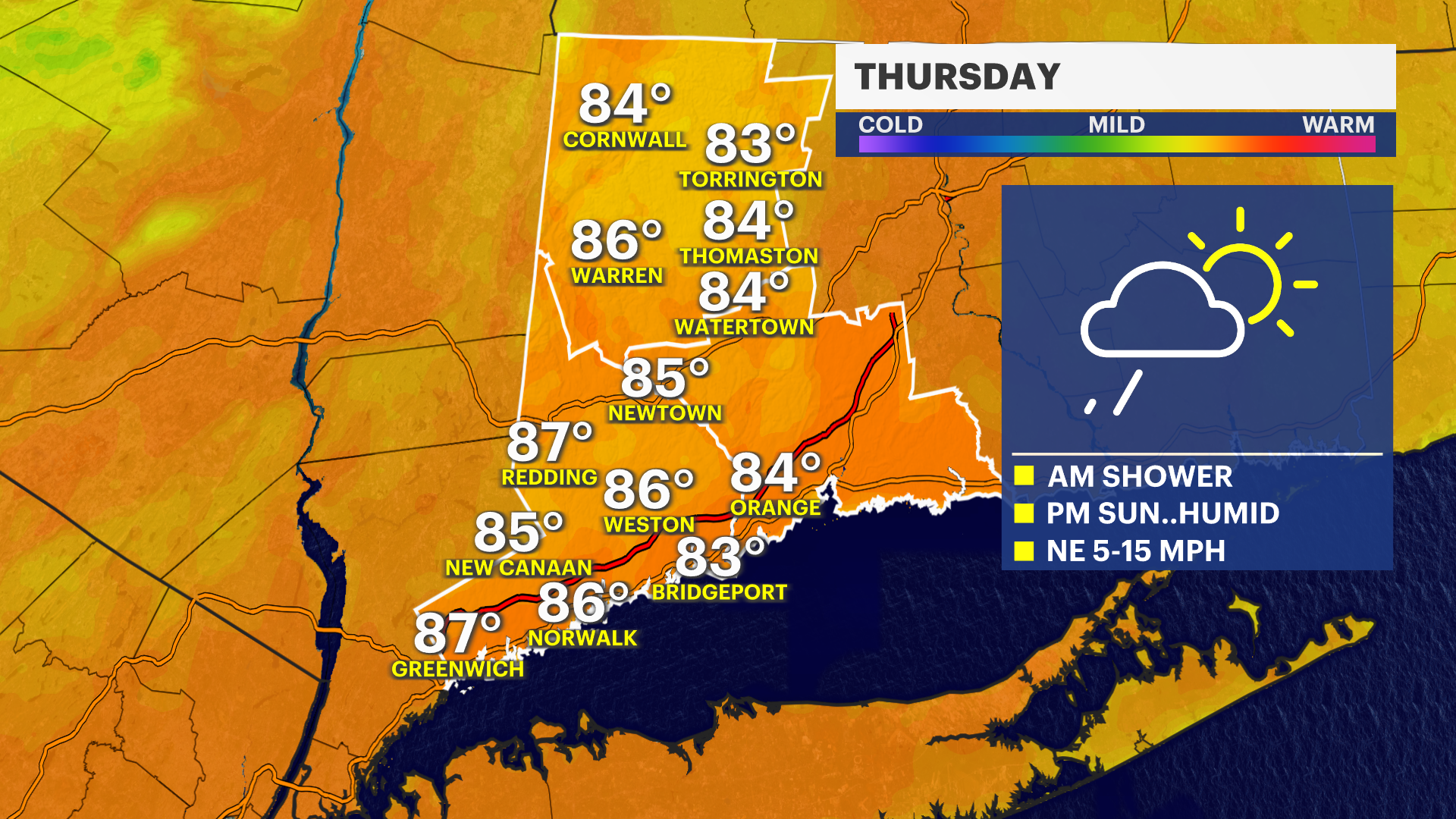 THURSDAY: Morning clouds with scattered showers, becoming mostly sunny and warm in the afternoon. Still humid. High of 83.