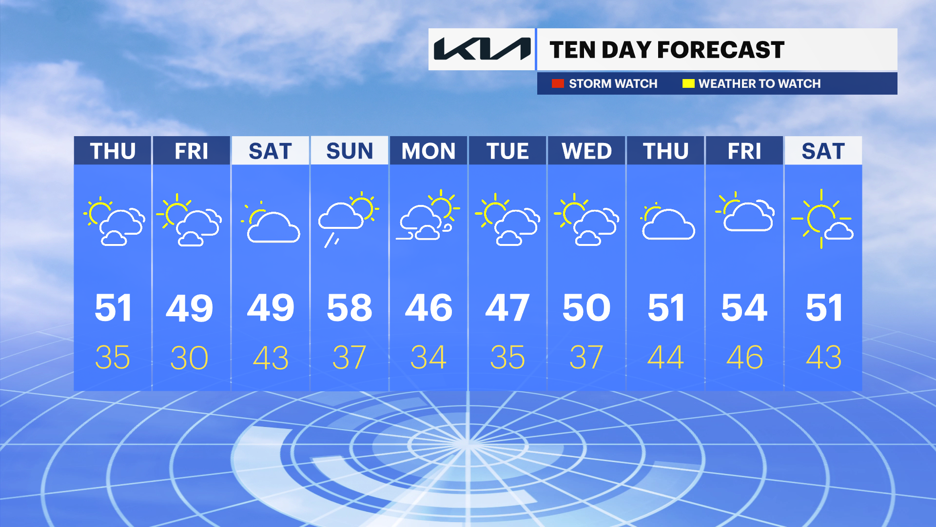 It's been a cold week and unfortunately for "warm weather lovers" temperatures do not rebound much for the foreseeable future. Today will be near 50 degrees which is similar to yesterday, but there is less wind and more sun so it will feel more comfortable overall. Aside from a stray shower, it's a nice Thursday.