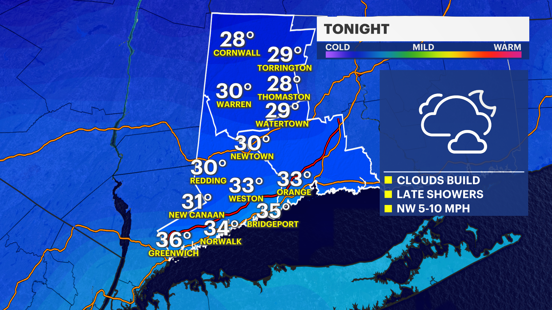 The clouds will collect late in the day with a slight risk of a few showers overnight and into early Wednesday.