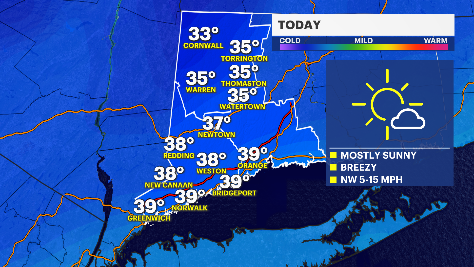 Today: Chilly Sunshine - Temperatures are in the upper 30s with mainly sunny skies. It will feel like the upper 20s with winds occasionally gusting to 20 mph.