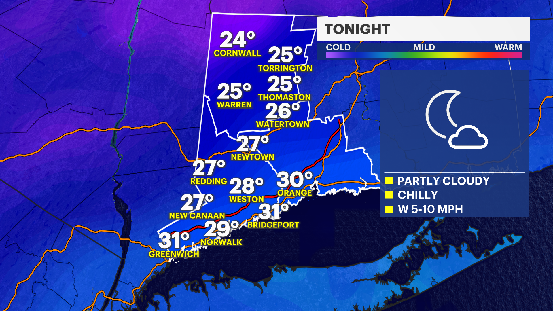 Tonight: Watch for Ice - Areas with snow cover in Nothern Fairfield, Northern New Haven, and Litchfield counties could see black ice tonight on untreated roads and sidewalks. Keep in mind overpasses will freeze before main roadways.