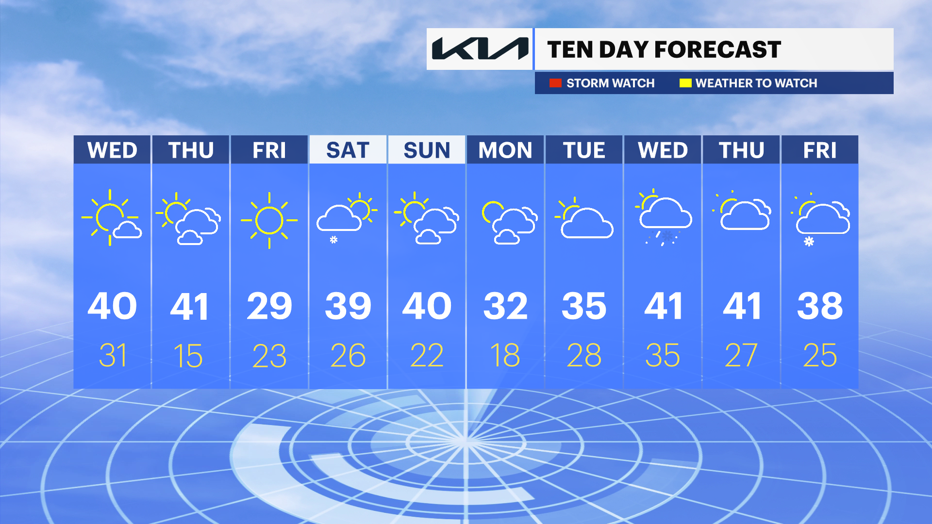 A snow shower is possible Saturday morning, otherwise there's a mix of sun and clouds with average temperatures. Temperatures will drop again next weekend.