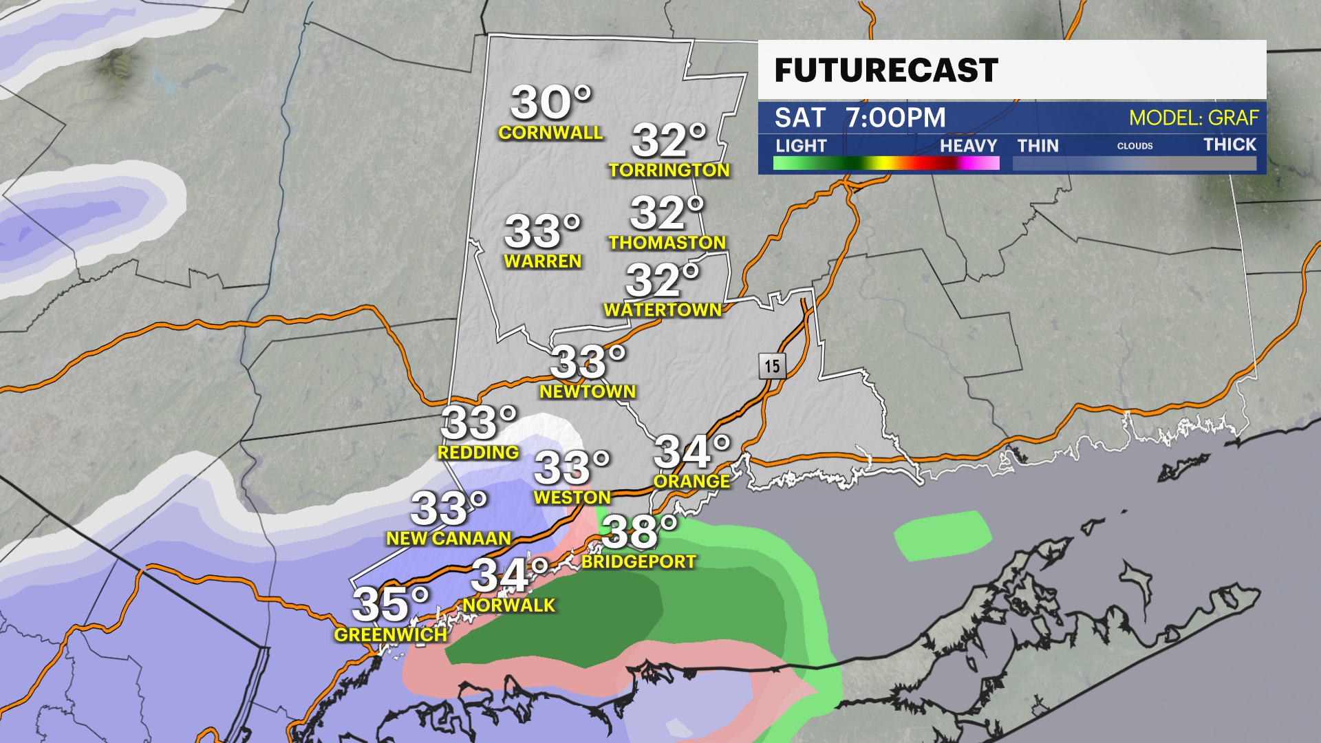 SATURDAY: Cloudy. Snow arrives by dinner time. Snow accumulations vary from a dusting to a quarter of an inch.
