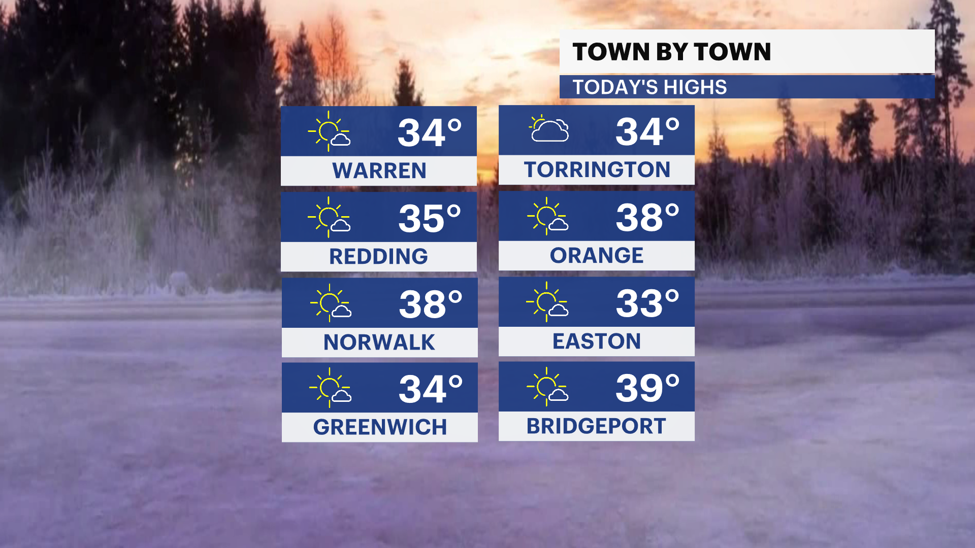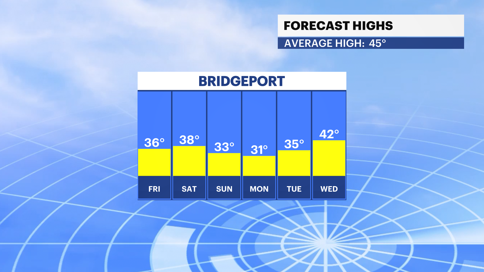 FRIDAY: Sunny, still cold. Breezy. Highs near 33. Overnight lows near 21.