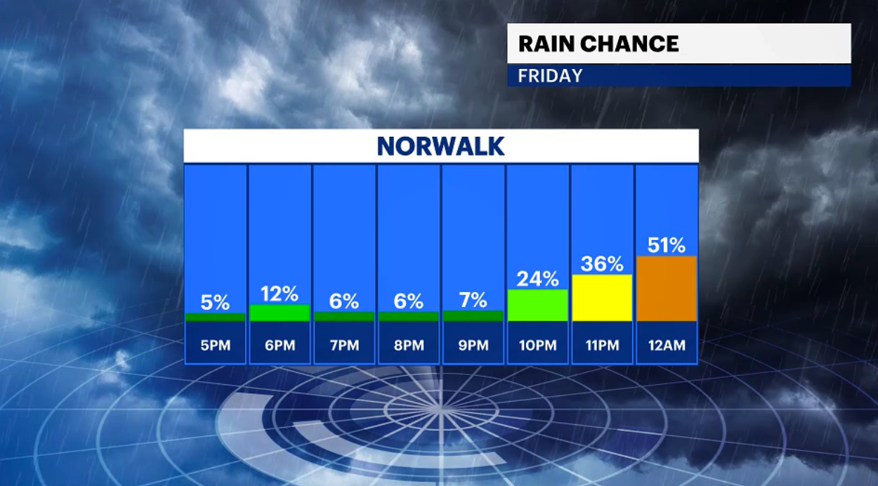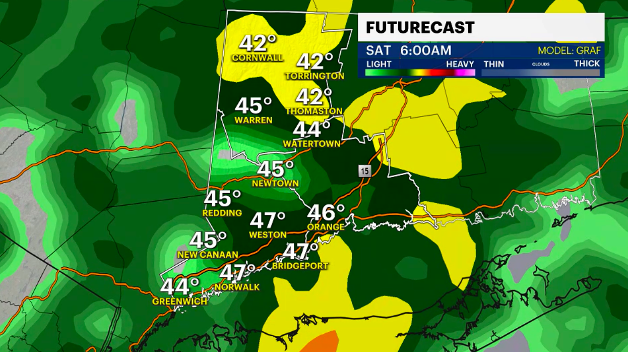 FRIDAY: Overcast morning, followed by late, limited sunshine in the afternoon. Temperatures flare up by midday, into low 50s. Late night rain arrives by 10 p.m. Highs near 53. Overnight lows 42.