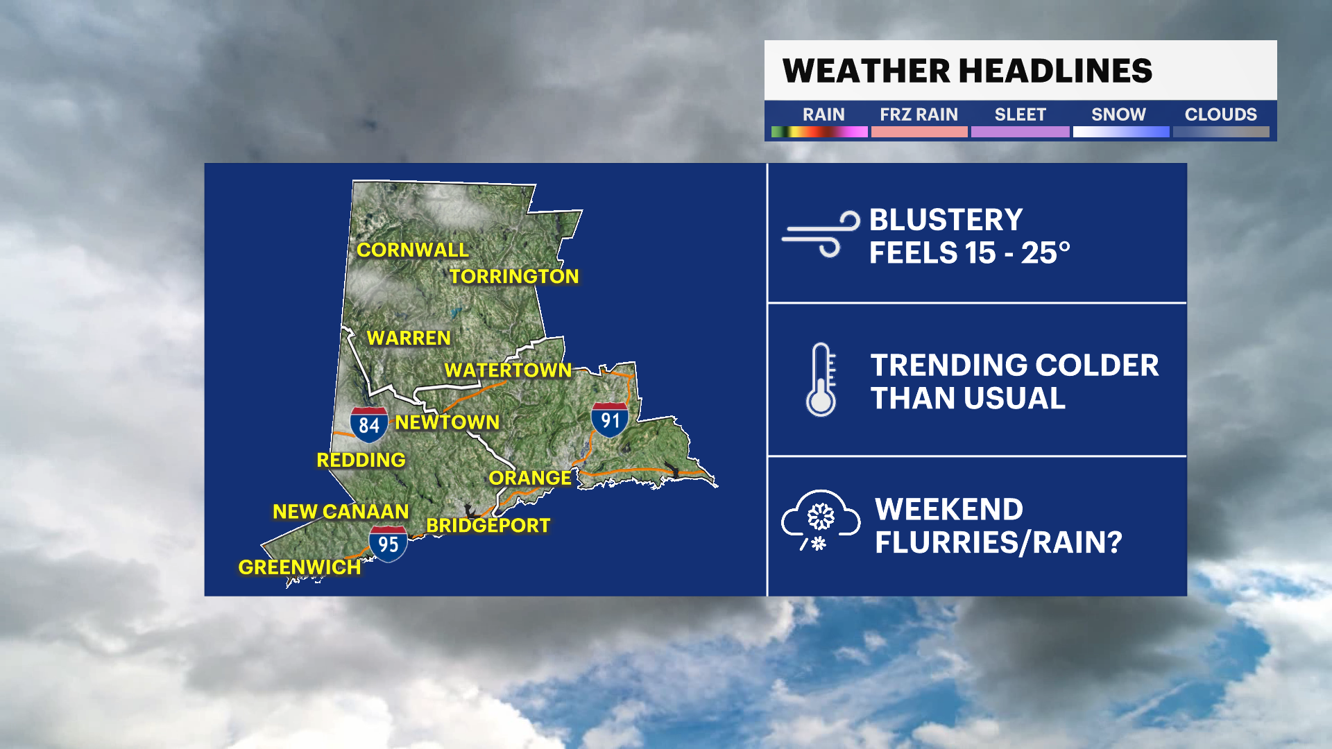 Expect breezy conditions to decrease on Saturday. However, we trade the sunshine for clouds on Saturday. A few flurries could amount to a dusting to a quarter of an inch on Saturday evening into Sunday morning.