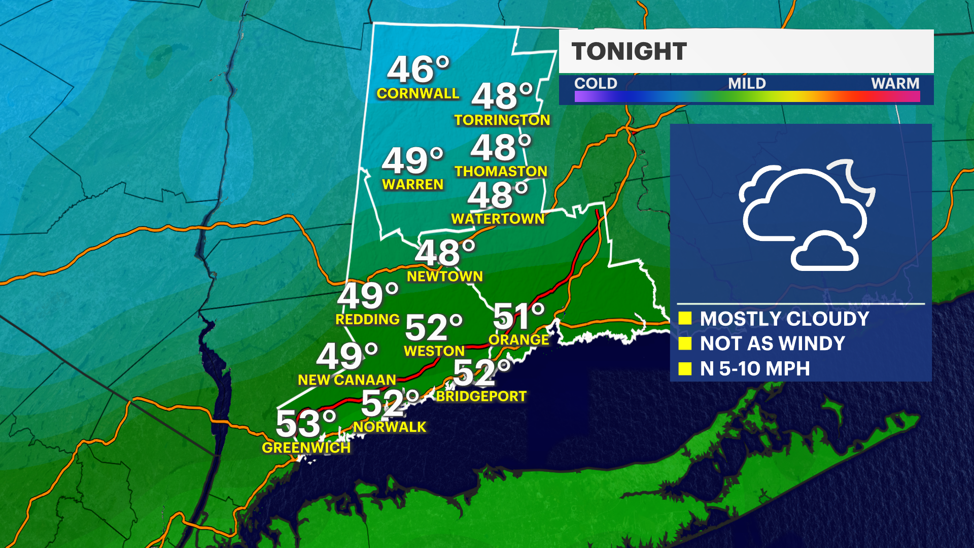Skies will stay mostly cloudy heading into the overnight hours with lows in the low 50s.