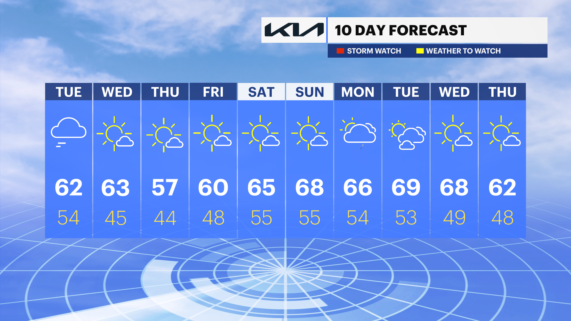 Temperatures slowly rebound heading into the weekend, reaching the low 60s Friday and climbing into the upper 60s to near 70 by Sunday under mostly sunny skies.