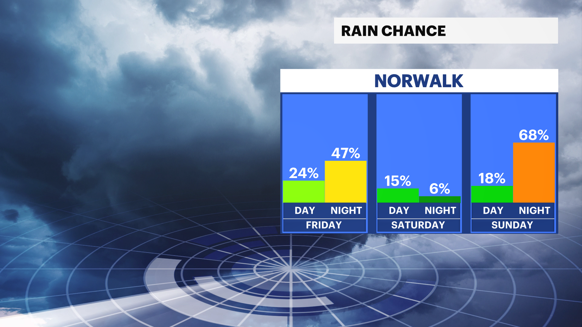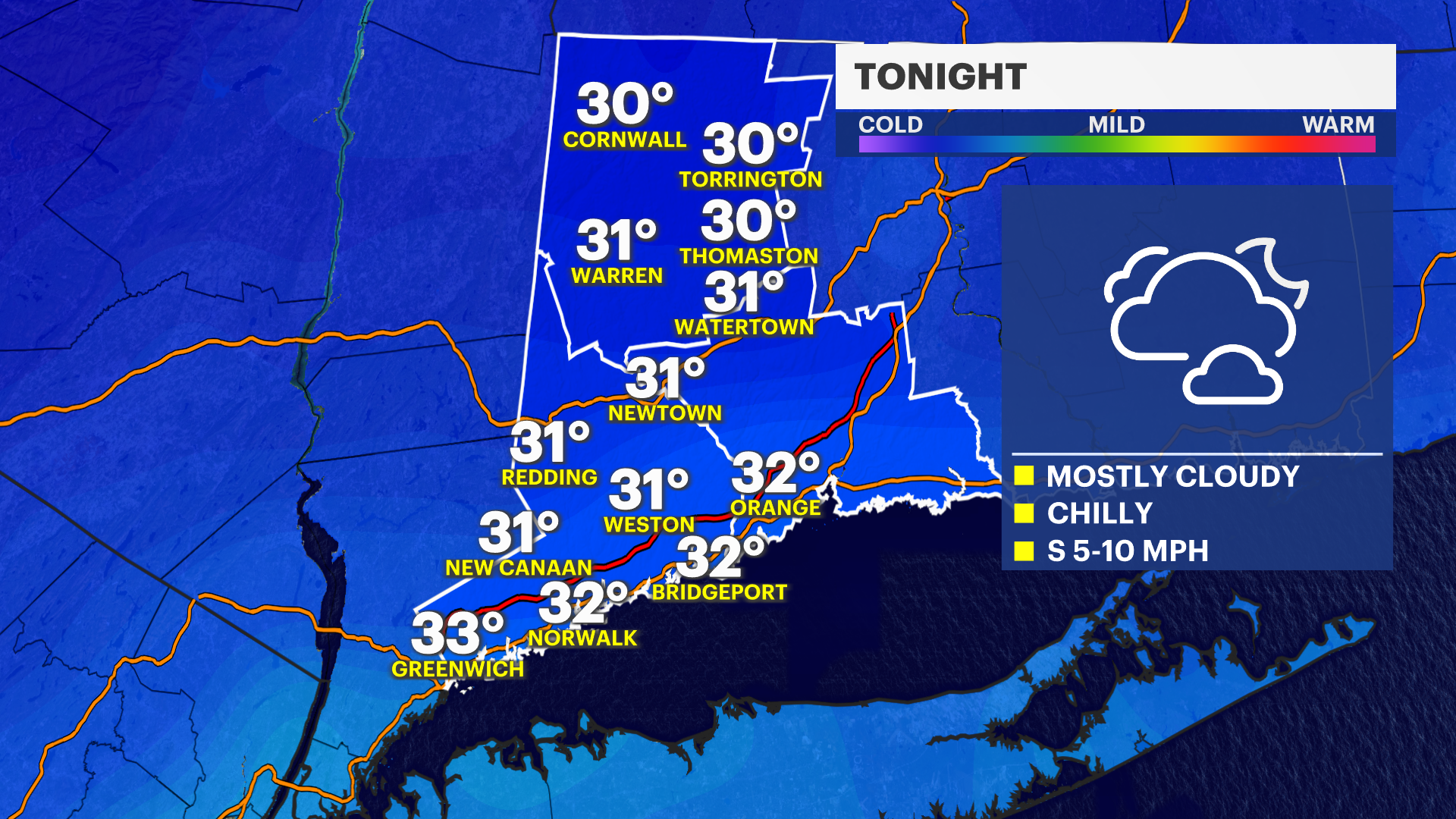 Sunday is mostly cloudy with a few afternoon showers. High temperatures will again be in the mid-50s.
