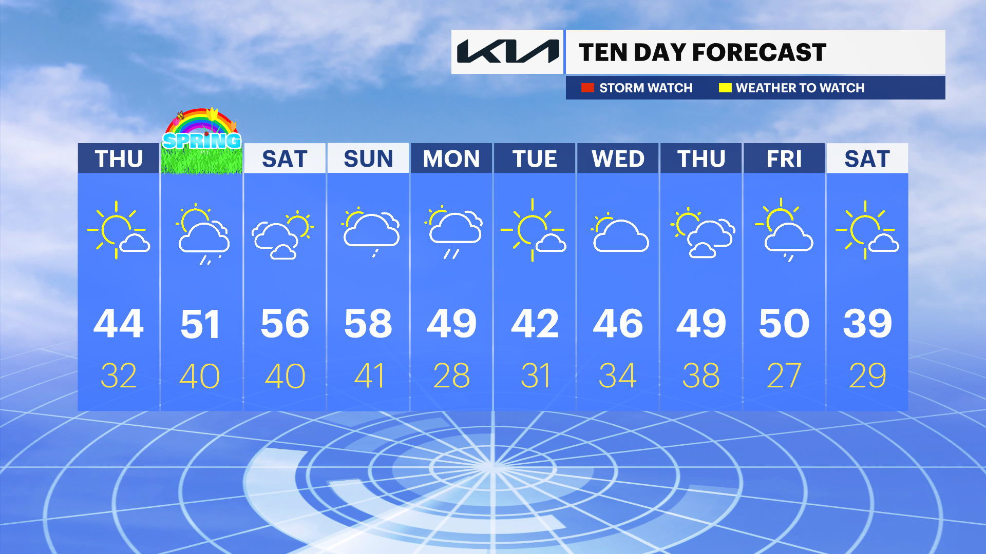 Spring officially arrives tomorrow, March 20 at 10:46 a.m. with the Vernal Equinox. While much of Friday will remain dry, there is a chance of showers sneaking in here after about dinnertime. Rain showers are expected to taper off by Saturday morning.