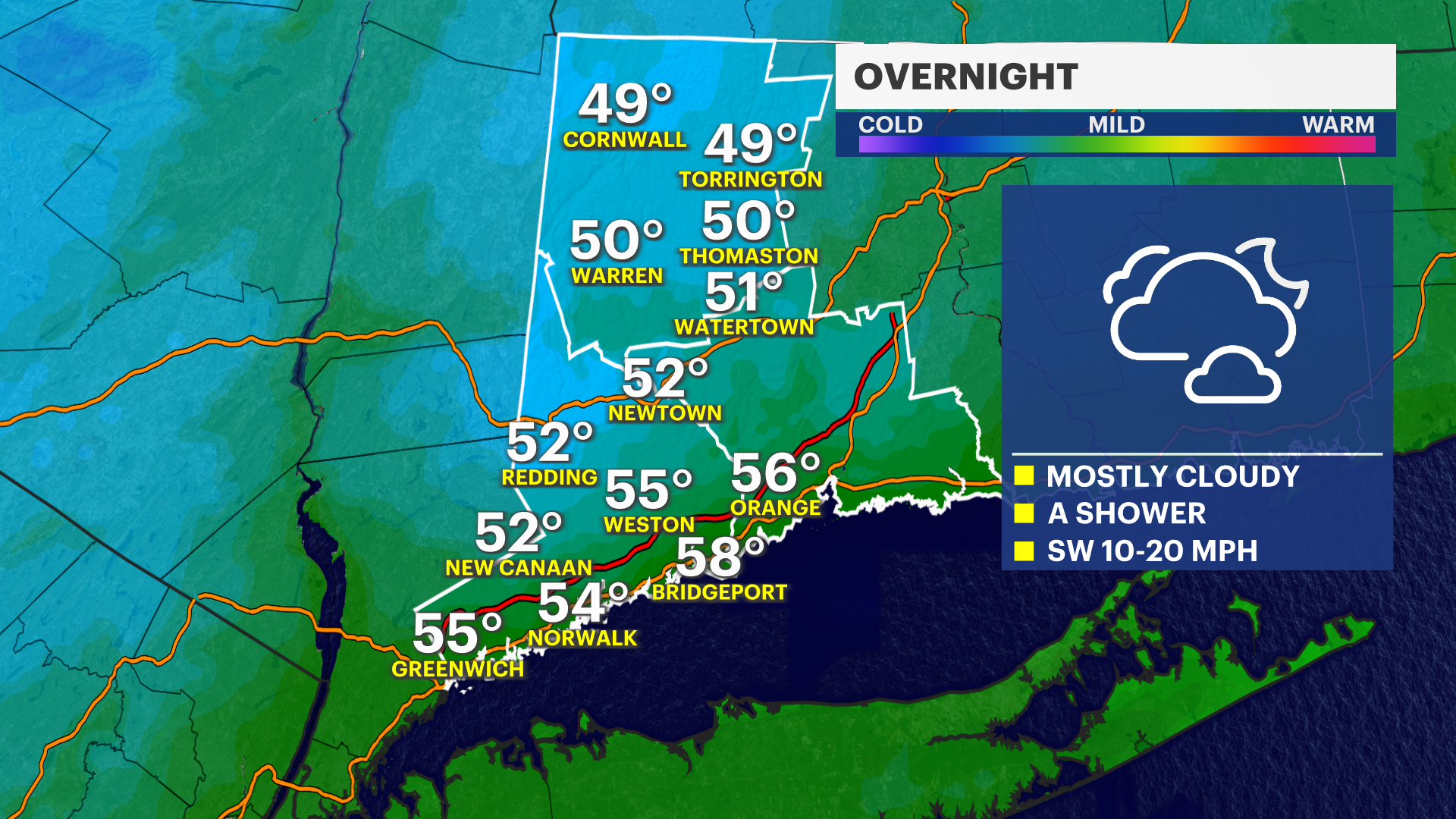 OVERNIGHT: Mostly cloudy with a passing shower or two. Low of 56.