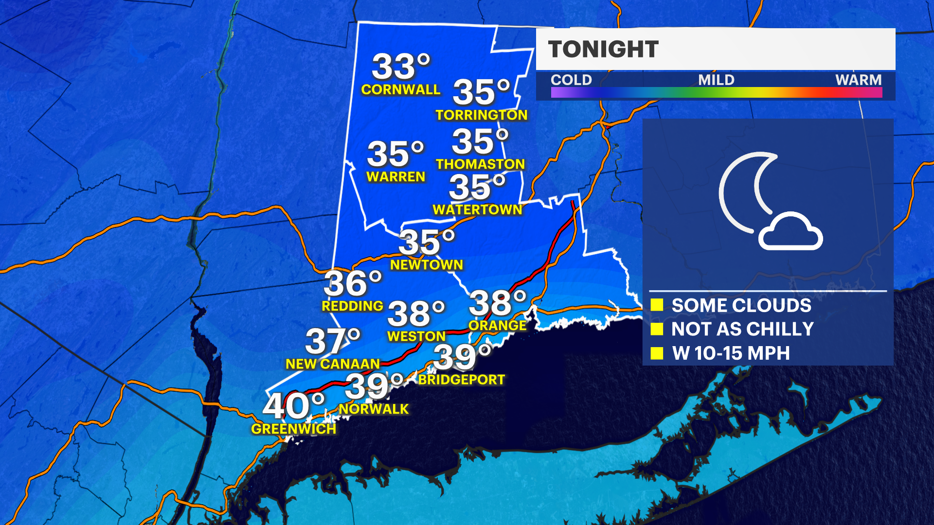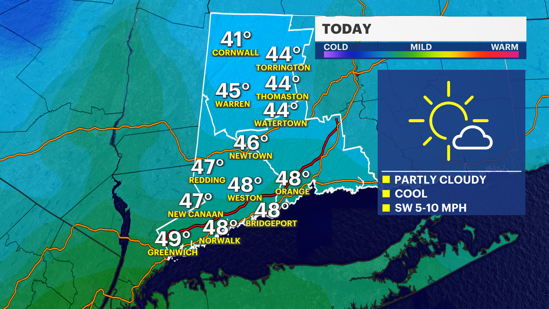 Today brings a bright, partly sunny day with a cool feel, followed by a clear and chillier night as a light west breeze picks up.