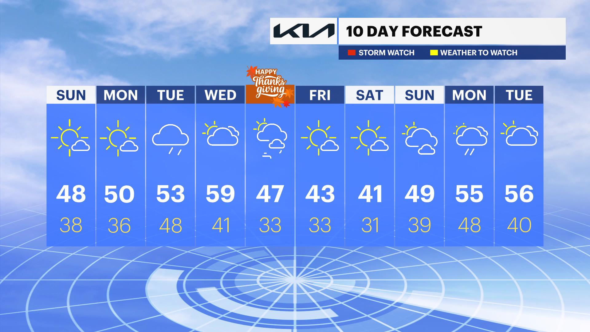 Midweek brings lingering, spotty showers Wednesday with milder temperatures, then drier and breezy conditions for Thanksgiving Day. The holiday looks bright but cool, with sunshine continuing into Friday and Saturday, along with crisp, seasonable air.