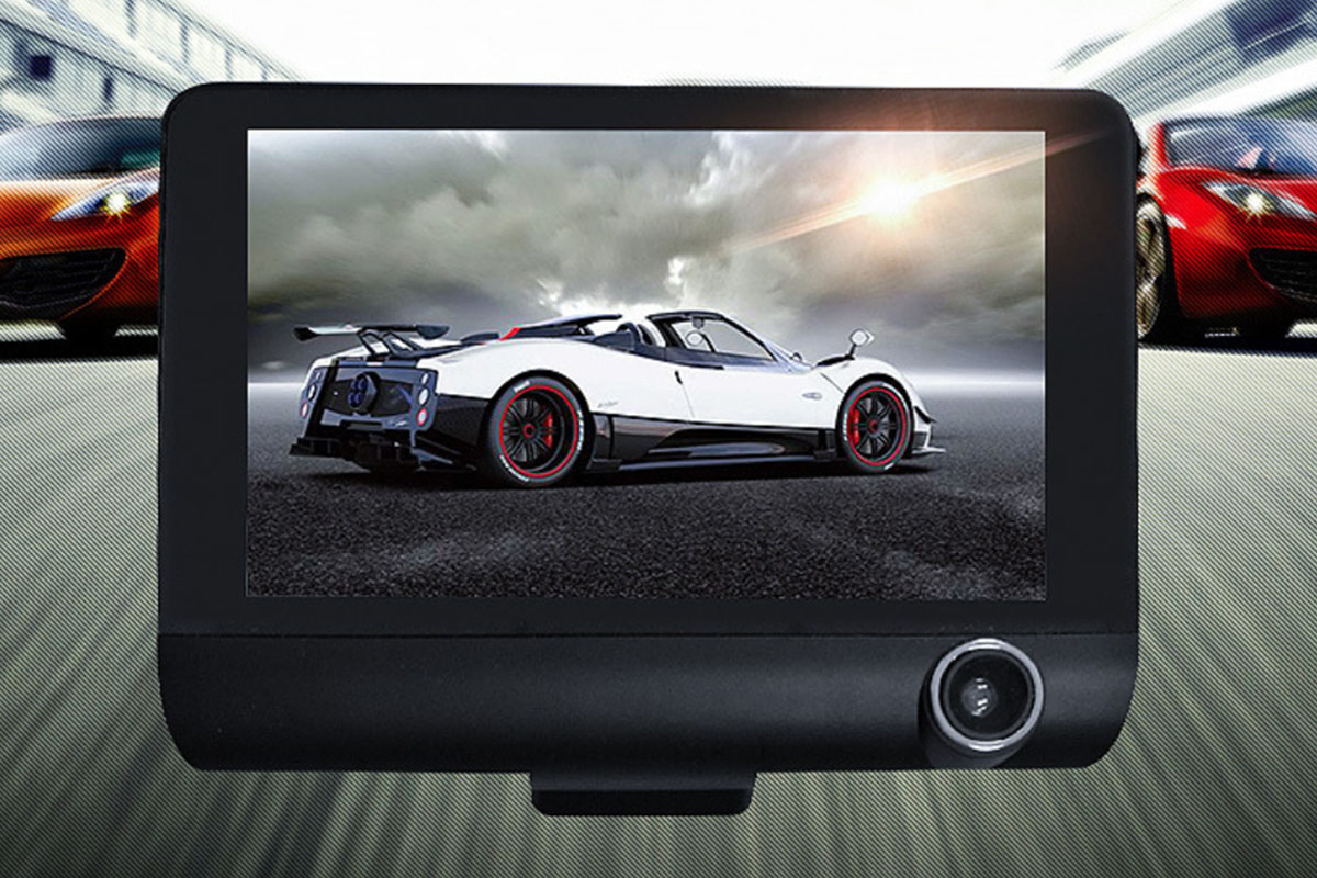 Records the inside of the car and the front of the car at the same time. A large four-inch screen so you can easily playback the video in the car, or you can remove the memory card and play it on any computer.