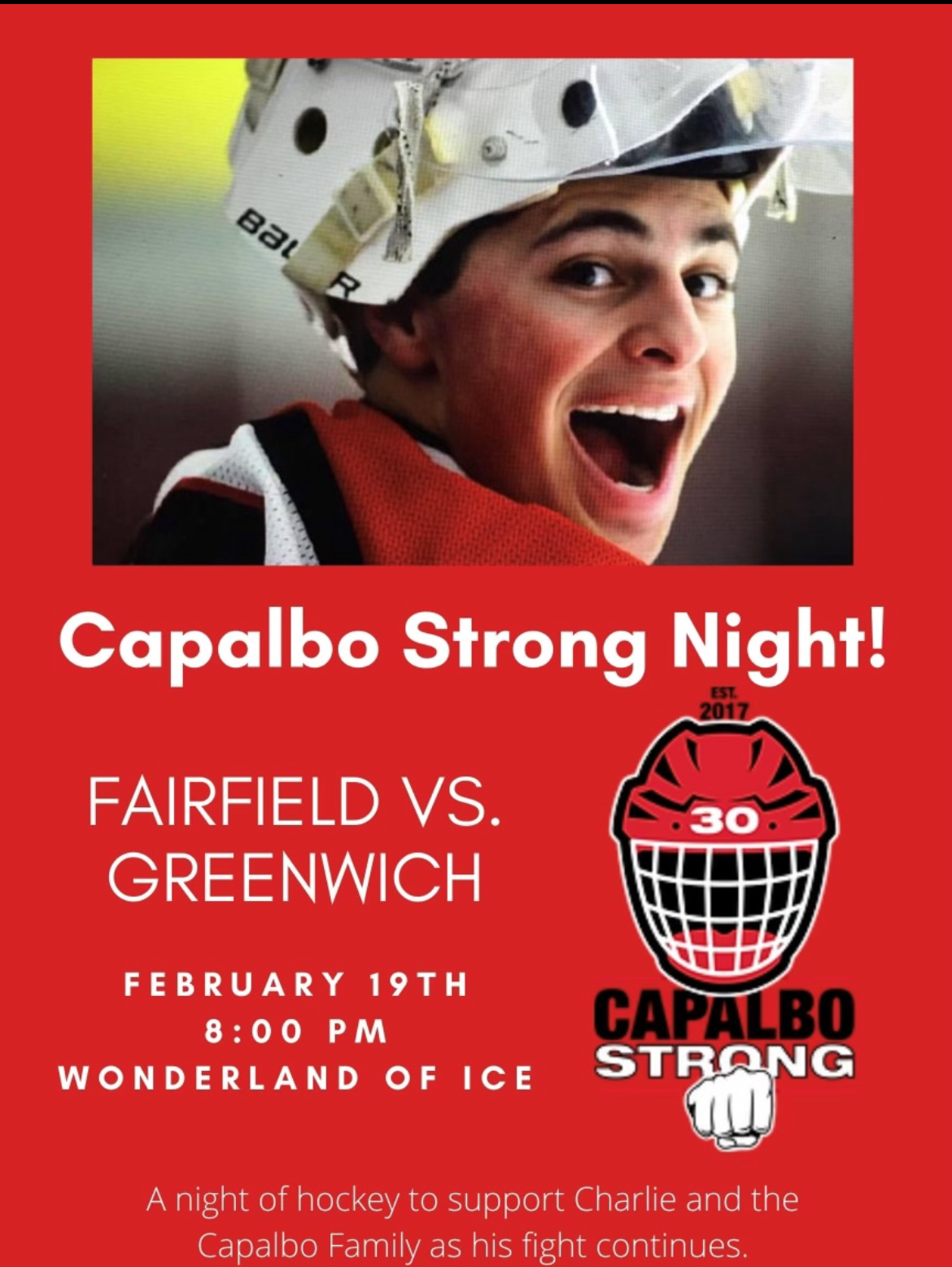 The boys on the team are playing Greenwich High School next Saturday night on the Wonderland of Ice rink in Bridgeport. They want to beat their rivals – and want a W for Capalbo.