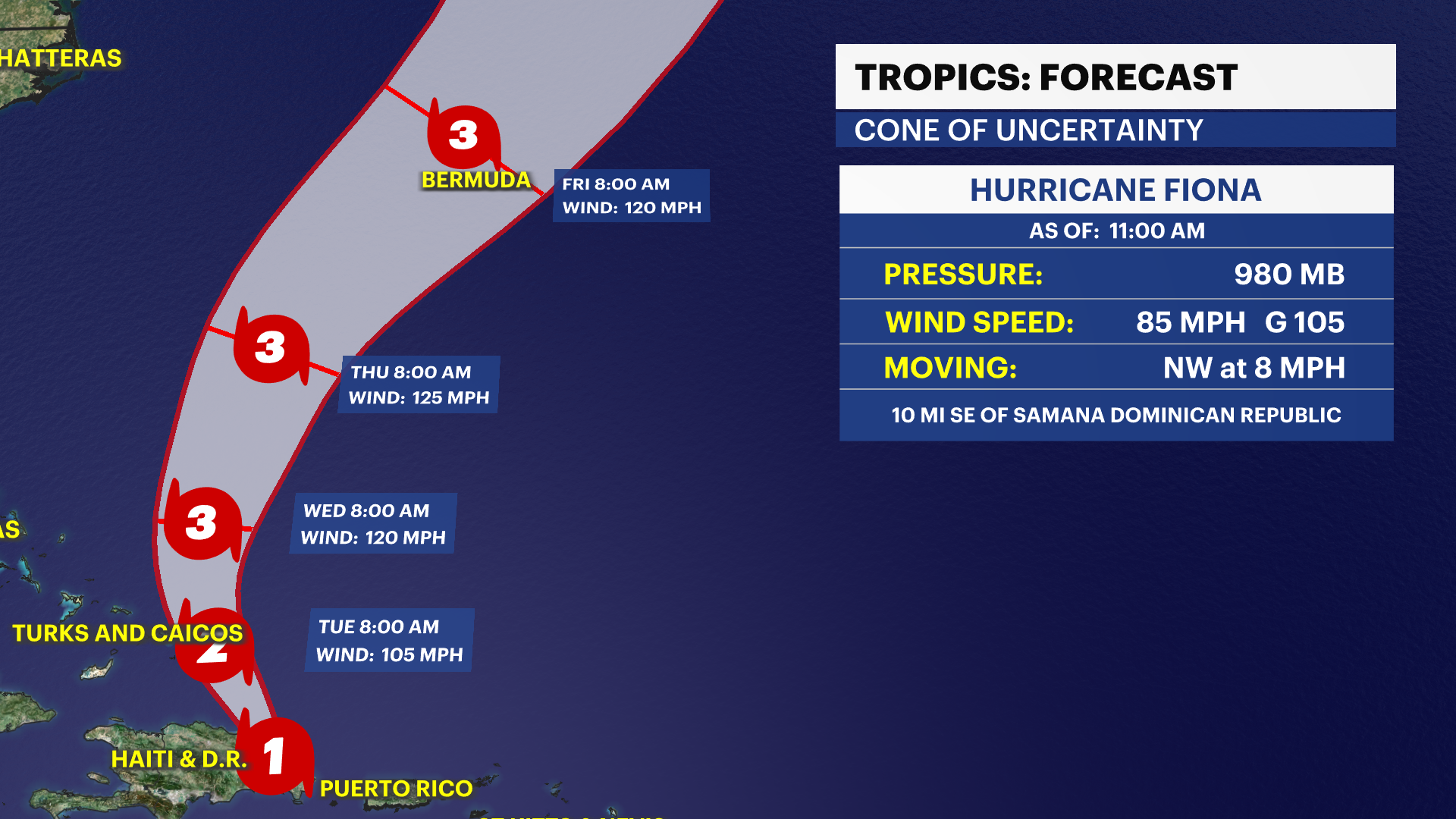 Hurricane Fiona is still bringing heavy rain to Puerto Rico. This will move toward the Dominican Republic with strong winds through tonight. Tropical Storm Fiona is expected to intensify to a Category 2 as it makes it northwestern turn toward the Turks and Caicos tomorrow. Heavy rain and destructive winds will impact parts of the Turks as the system moves away from Puerto Rico and Dominican Republic tomorrow.
