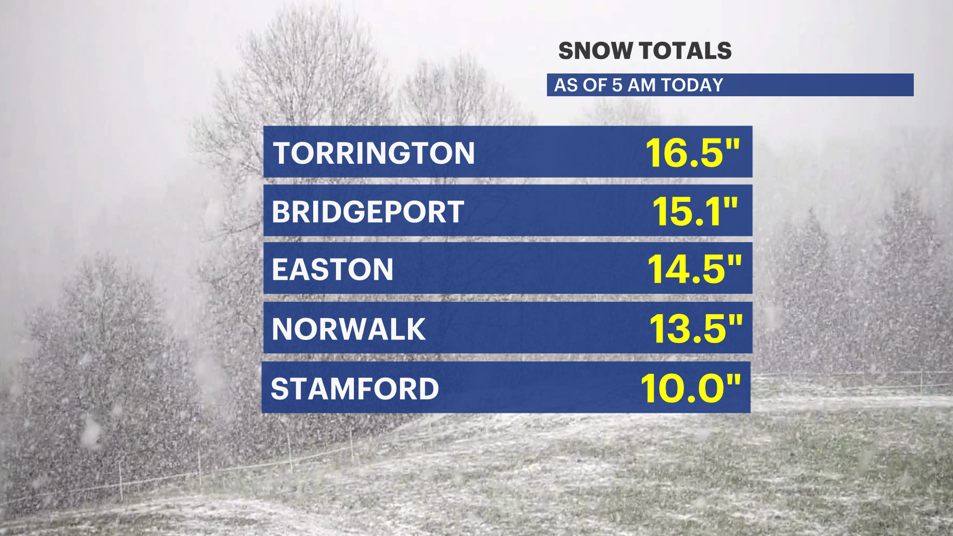 Torrington reported the highest snowfall so far at 16.5 inches, while Bridgeport measured 15.1 inches, highlighting how intense bands of snow pushed well into southwestern Connecticut. Easton wasn’t far behind with 14.5 inches, and Norwalk picked up 13.5 inches during the overnight hours.