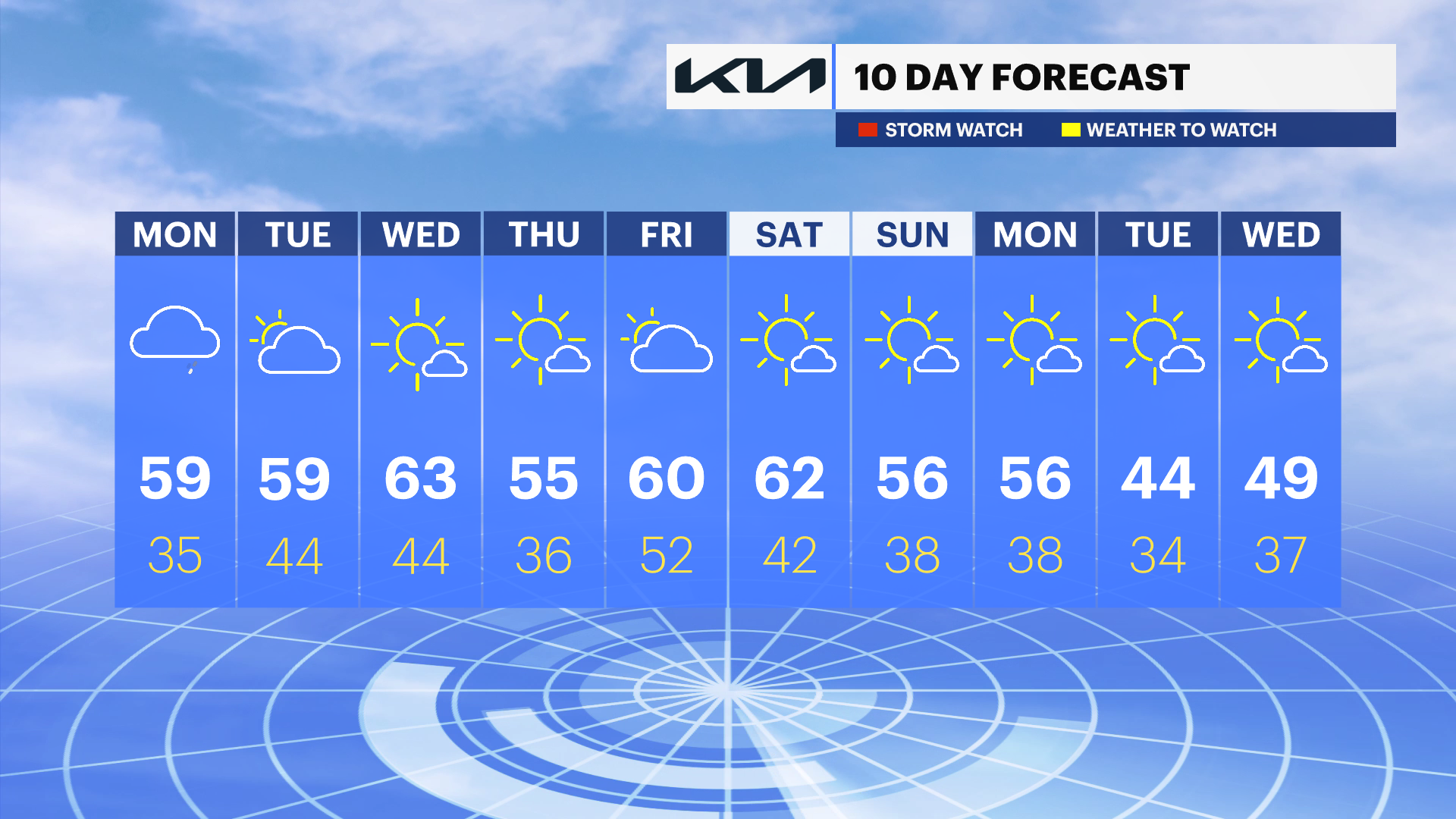 The rest of the week is dry with a mix of sun and clouds. Temperatures are slightly above average with highs in the low 60s before cooling off by Thursday with 50s. Overnight lows in the 30s and 40s.