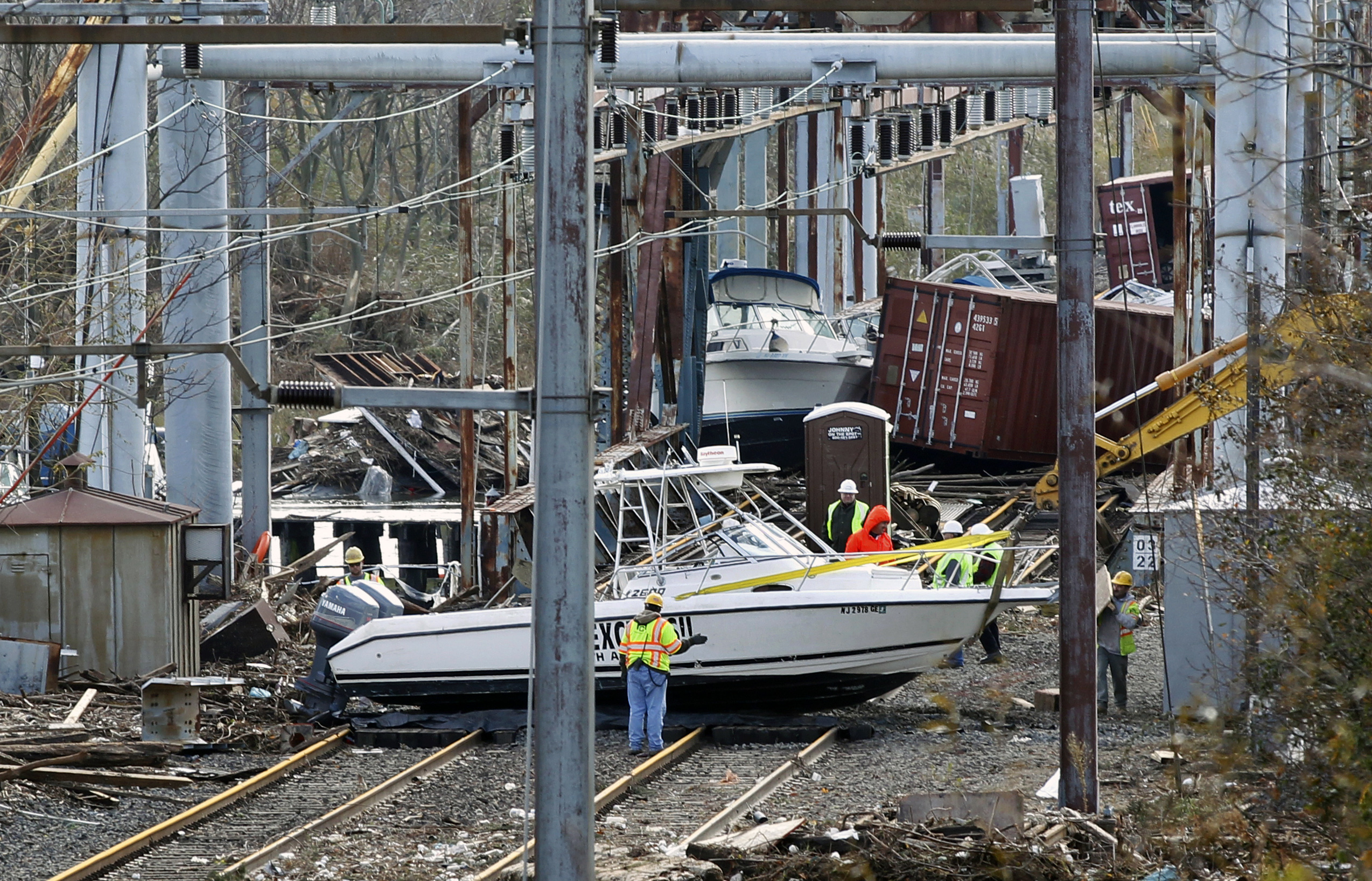 Workers try to clear boats and debris from the New Jersey Transit's Morgan draw bridge after surge from Superstorm Sandy pushed boats and cargo containers onto the train tracks. (AP)