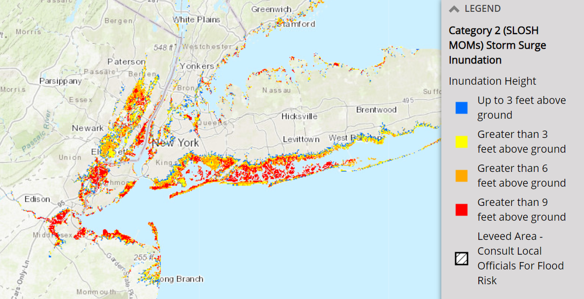 NOAA's storm surge map shows expected water inundation from coastal flooding. The image here is for that of a category 2 hurricane. (NOAA/NWS/NHC Storm Surge Unit)