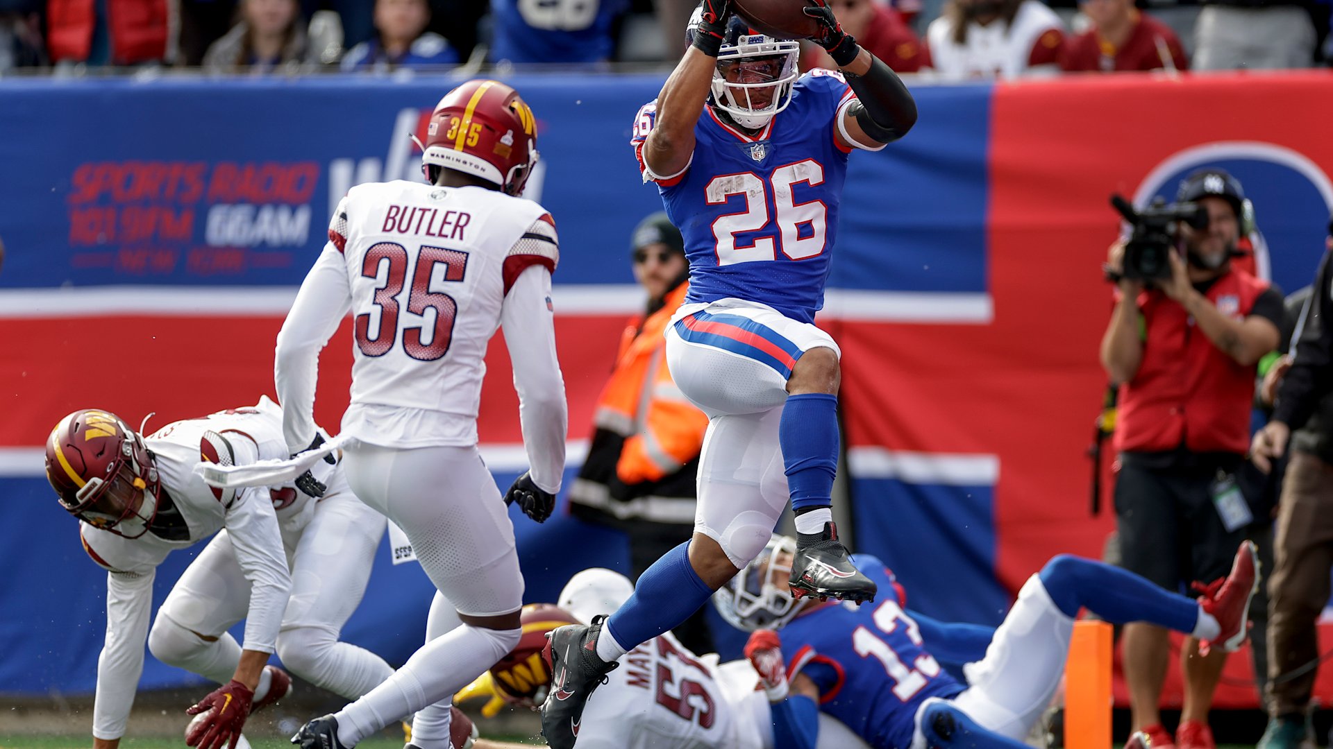 New York Giants running back Saquon Barkley (26) crosses the goal line for a touchdown against the Washington Commanders during the second quarter of an NFL football game, Sunday, Oct. 22, 2023, in East Rutherford, N.J. (AP Photo/Adam Hunger)