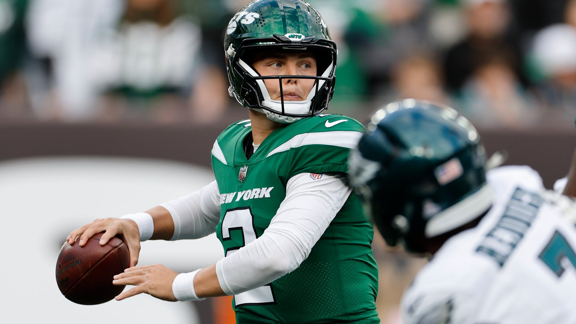 New York Jets quarterback Zach Wilson throws during the first half of an NFL football game against the Philadelphia Eagles, Sunday, Oct. 15, 2023, in East Rutherford, N.J. (AP Photo/Noah K. Murray)