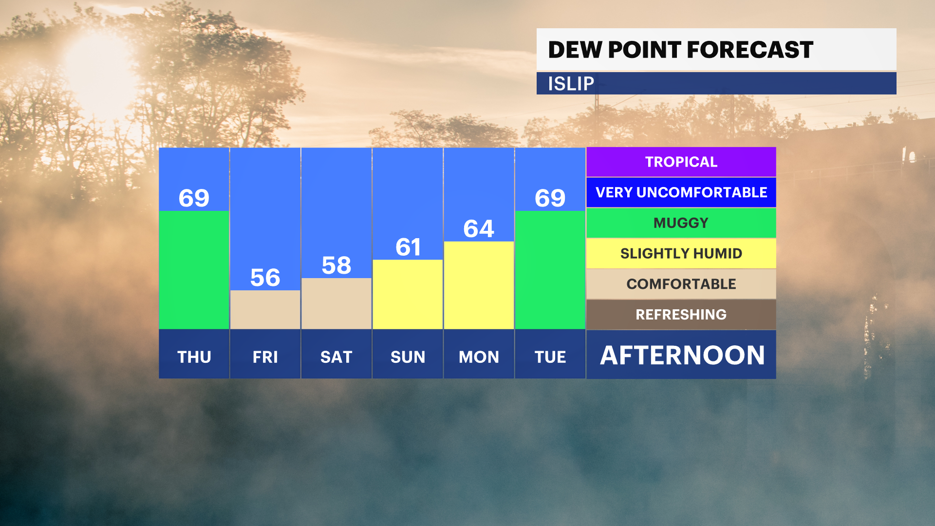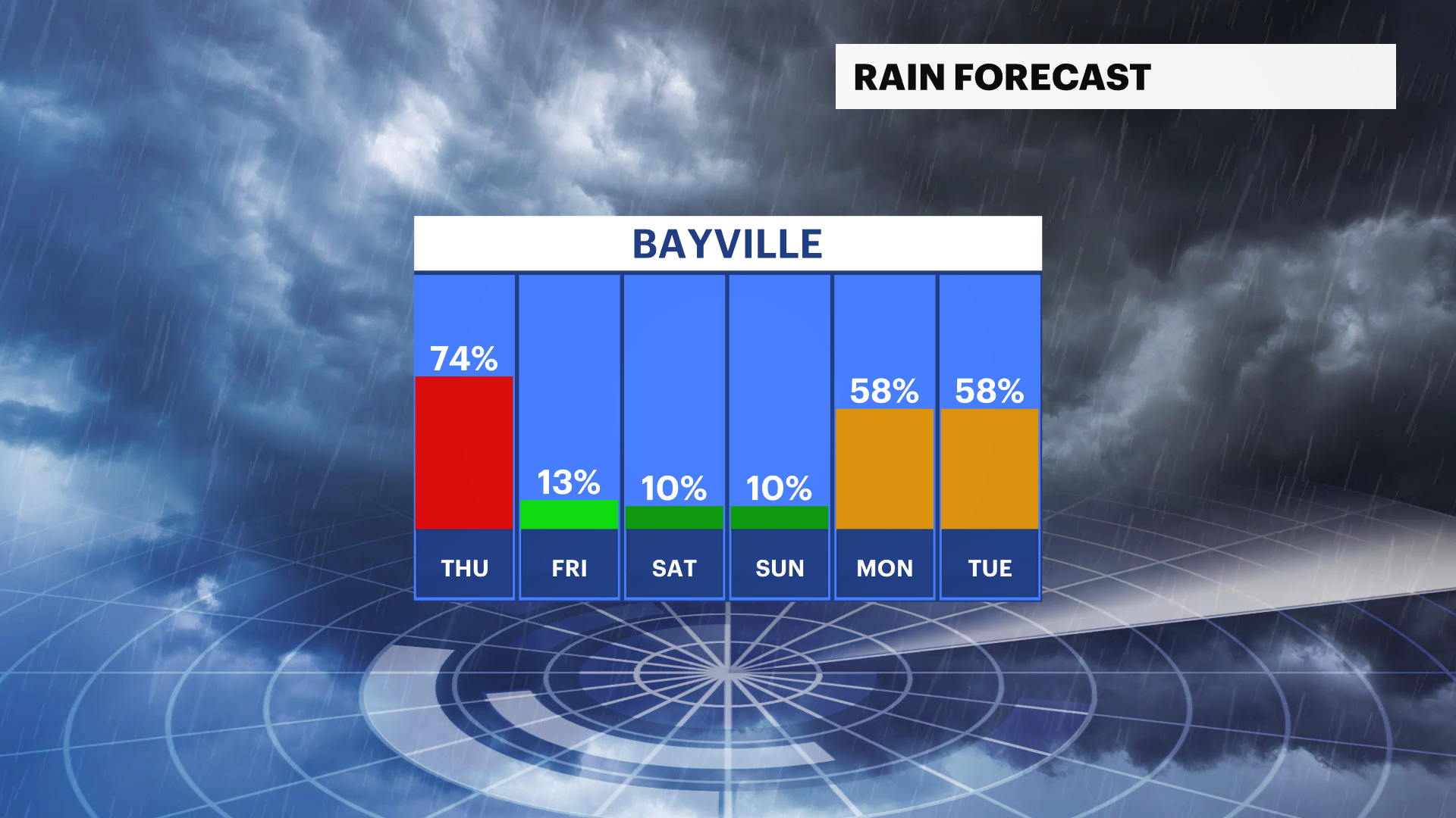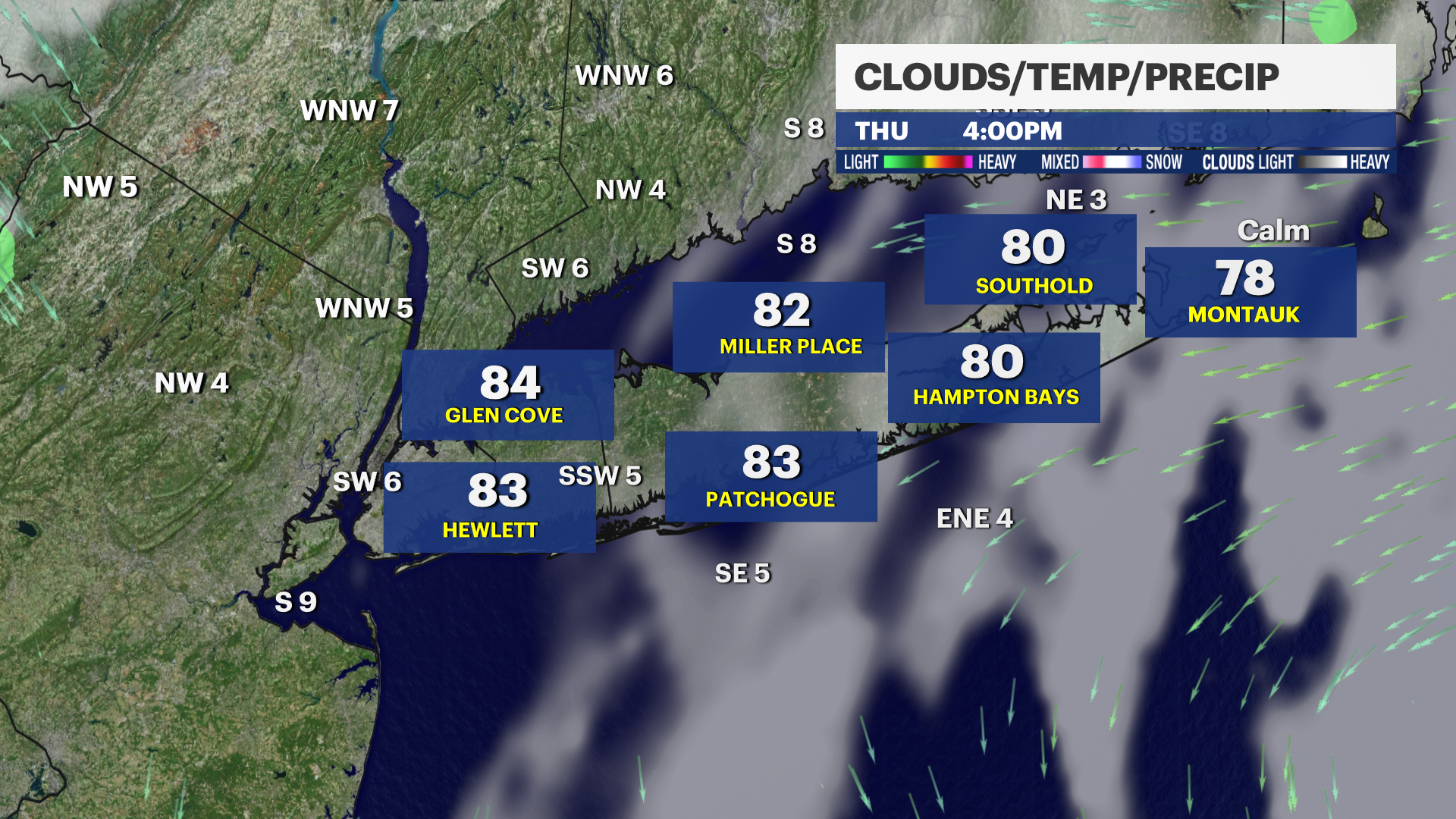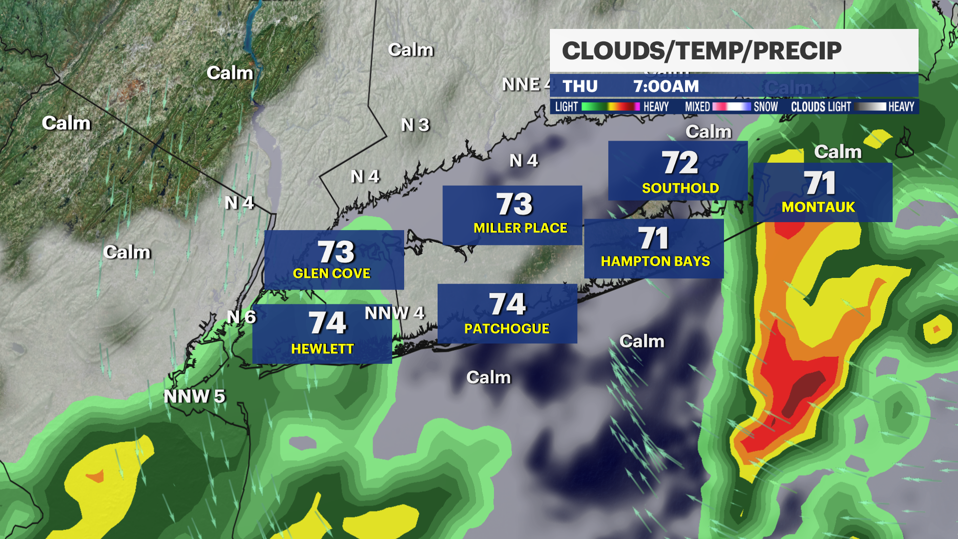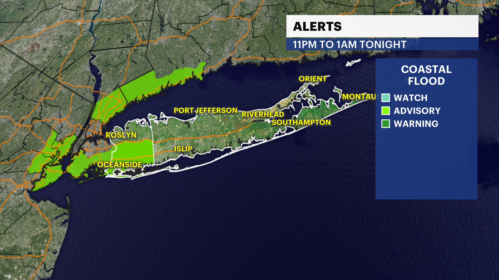 WHAT'S NEW: Tracking showers and thunderstorms late tonight into the Thursday morning commute. Some locally heavy rainfall is possibly early in the morning but no big impacts. A Coastal Flood Advisory is also in effect for the South Shore of Nassau for high tide tonight. Tides about 1 foot above normal could bring some minor flooding to low lying areas.