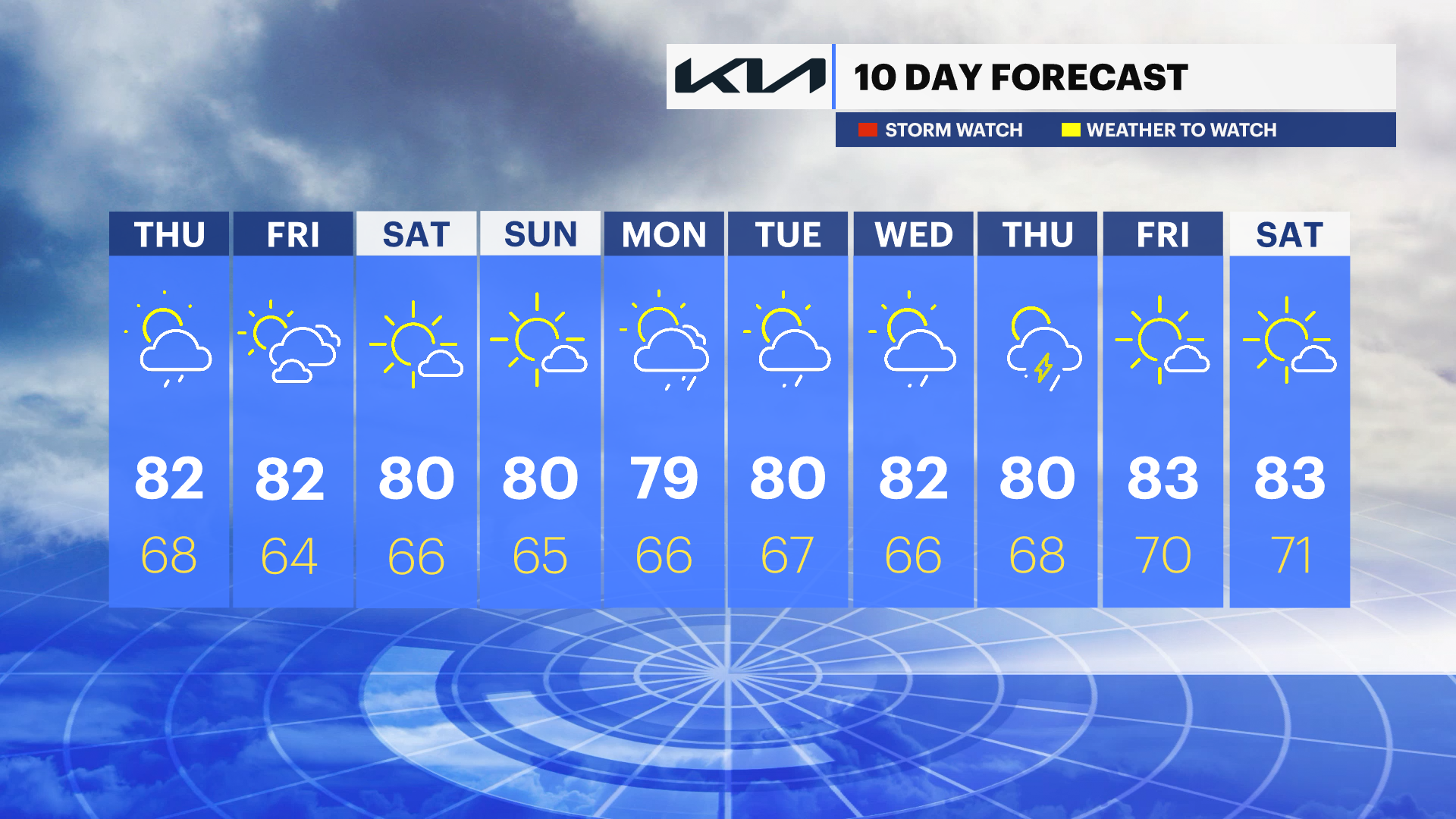 FRIDAY: Mostly sunny. Slight chance for a stray shower late in the day. Nice with highs near 82. Lows near 64.