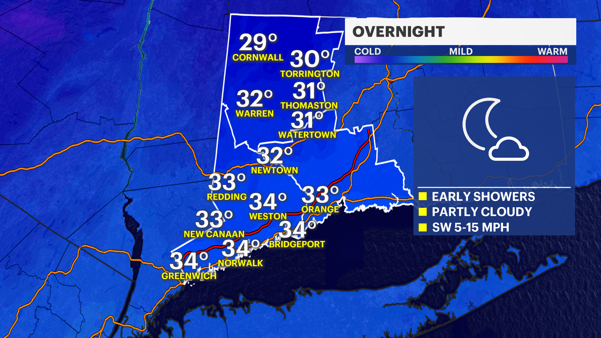 OVERNIGHT: A few early showers, otherwise partly cloudy and chilly. Low of 33.