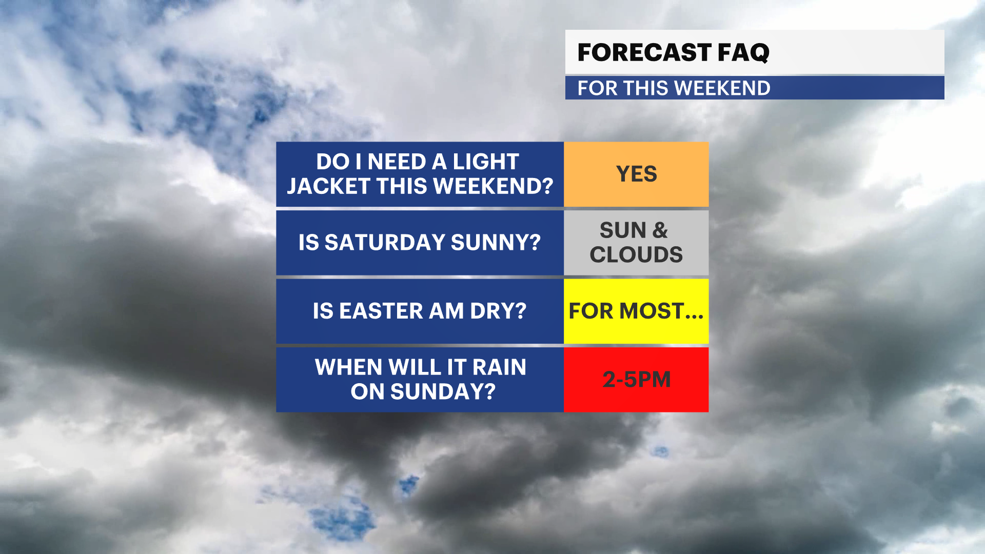 TUESDAY: Mostly sunny to mostly cloudy with a late day shower chance. Highs: Upper 40s.