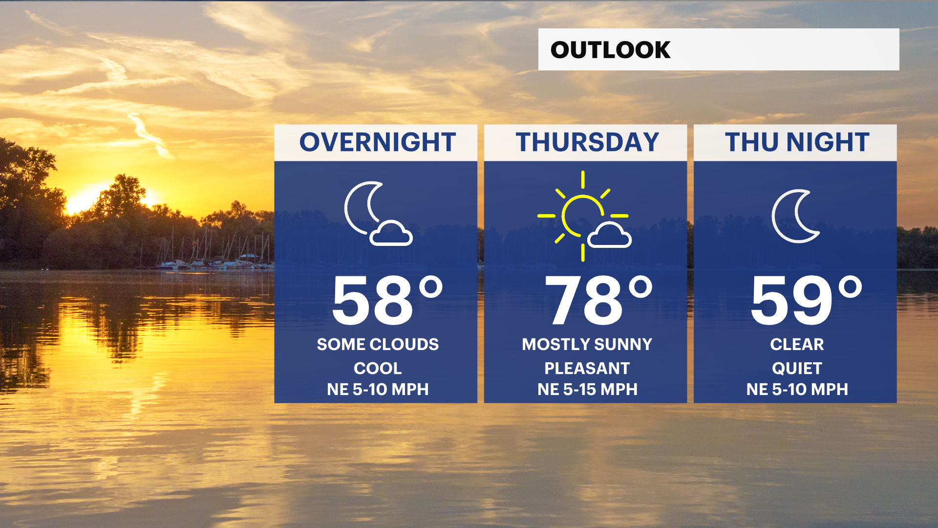 NOW AND NEW: Storm Watch Team Meteorologist Steve Teeling says skies should be mostly clear by morning with lows in the 50s. Thursday will be mostly sunny and warmer with highs in the upper-70s.