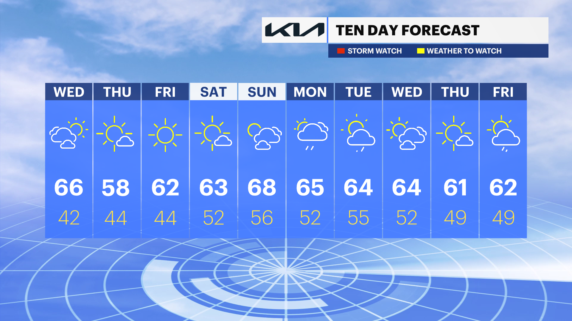 Saturday: Cool to start, in the low to mid 40s, then nice in the afternoon. Sun and clouds. Highs in the mid-60s.
