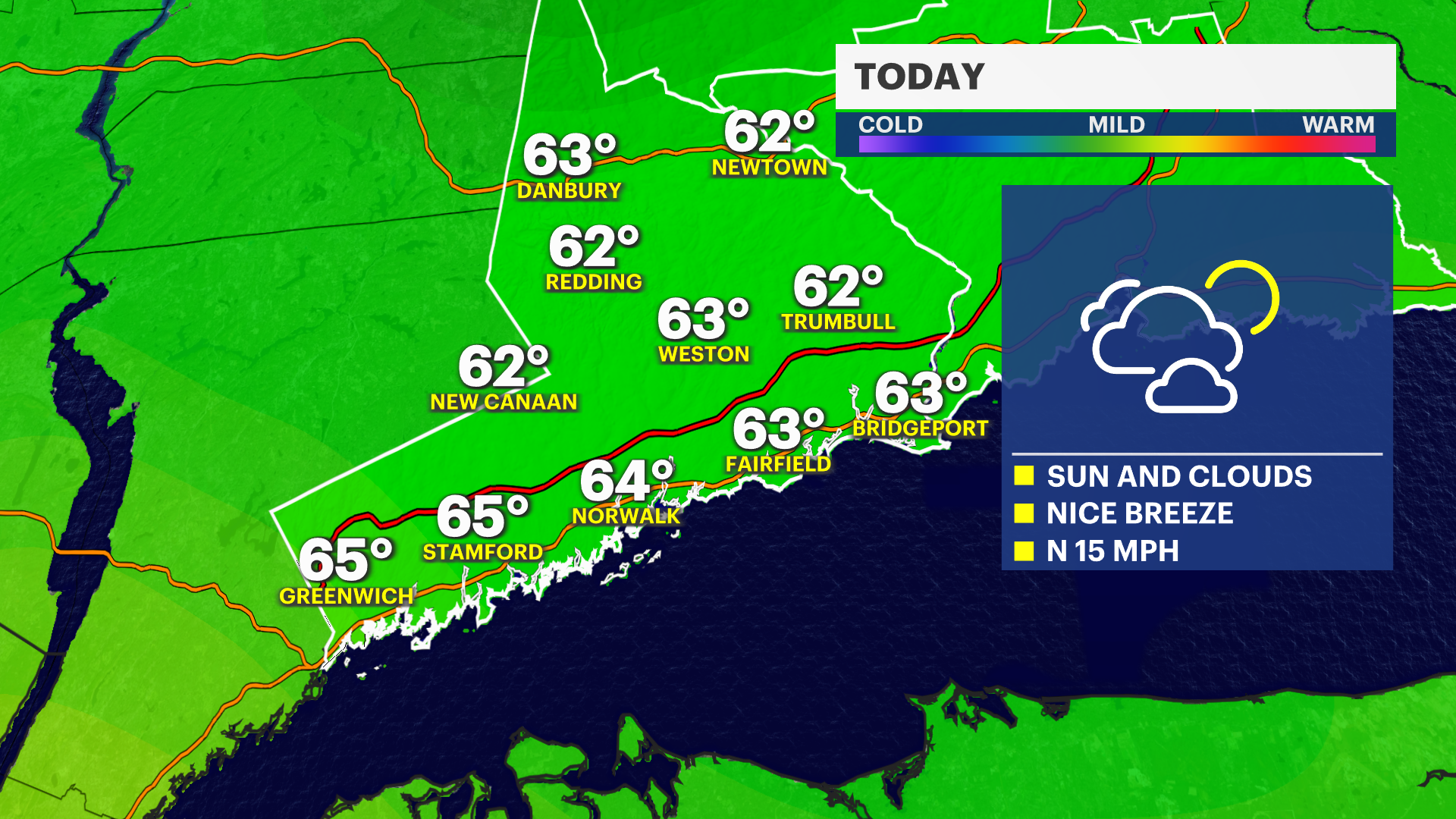 Today: A mix of sun and clouds becoming sunnier in the afternoon. Breezy. Wind from the north at 15 mph. Highs in the mid-60s.
