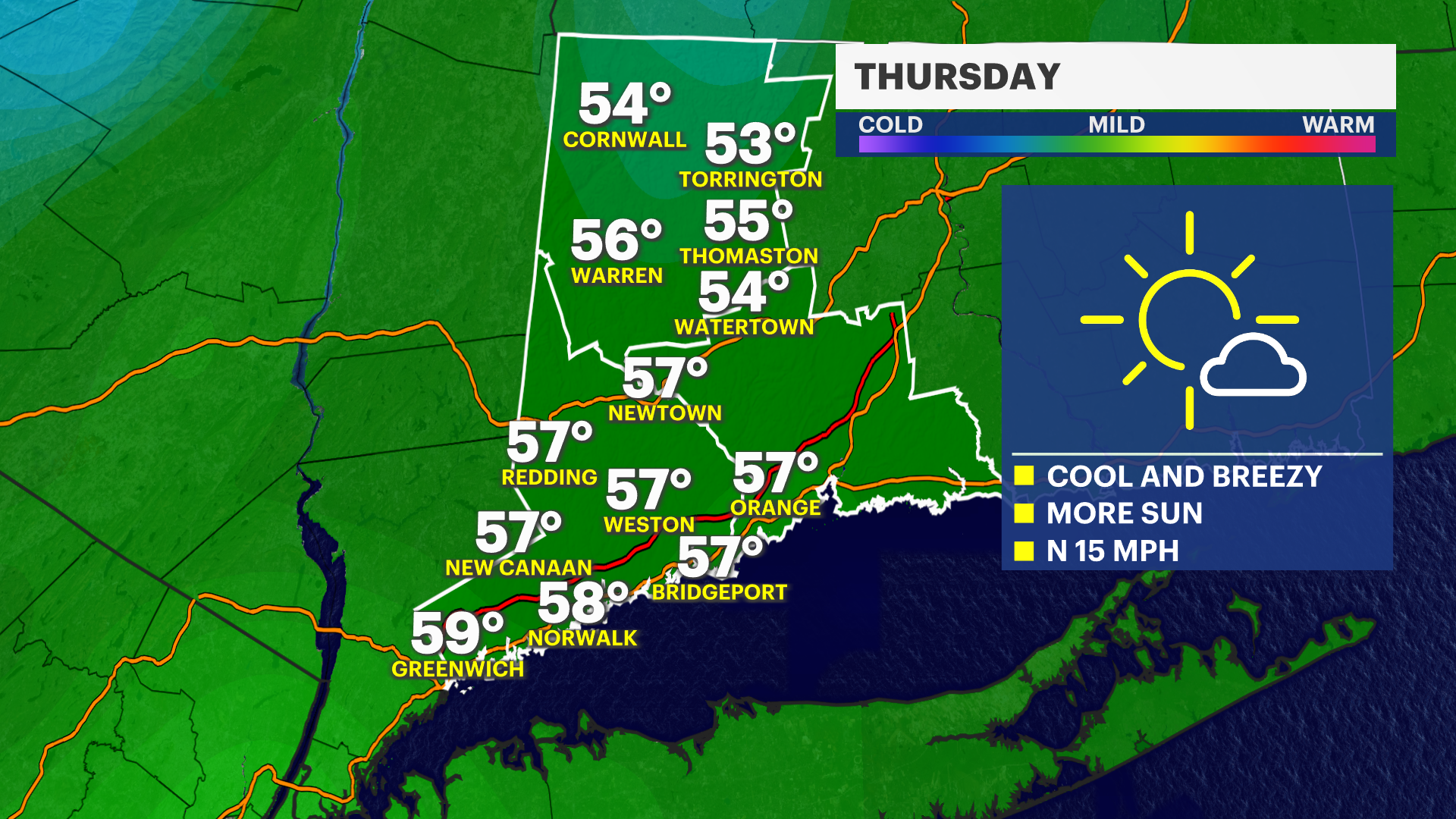 Thursday: Sunny, cool and breezy. Highs in the upper 50s with winds from the north at 15 mph.