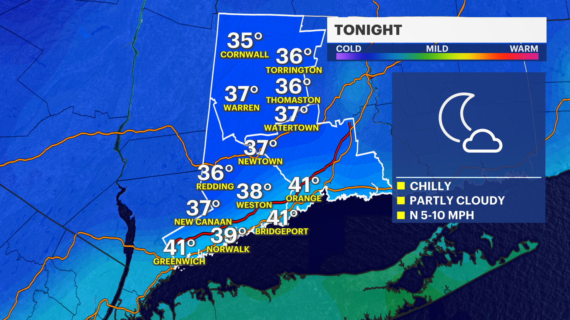 TONIGHT: Partly cloudy, chilly. Lows in the upper 30s.