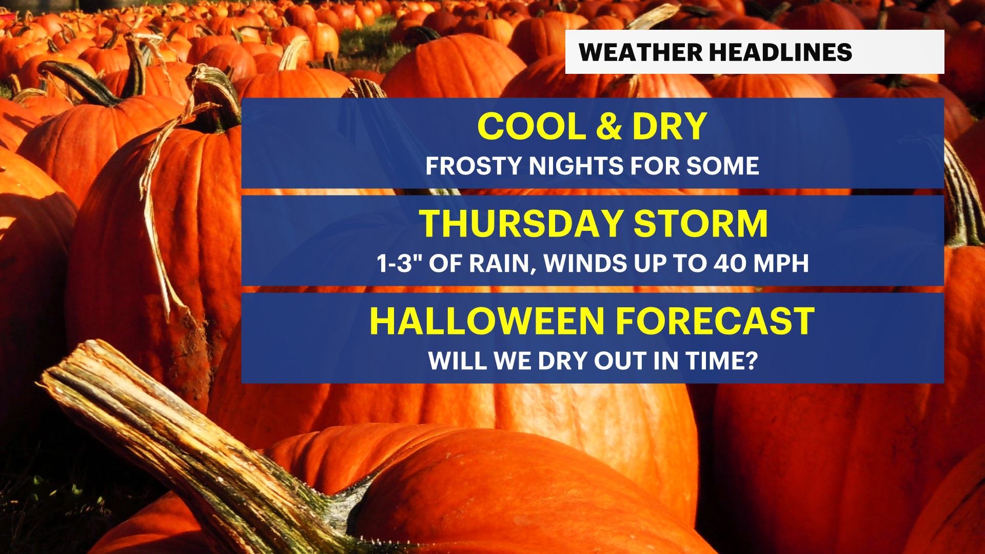 Thursday looks to be the wettest day, but conditions are expected to improve just in time for Halloween night. In total, 1-3 inches of rain is possible with wind gusts up to 40 mph.