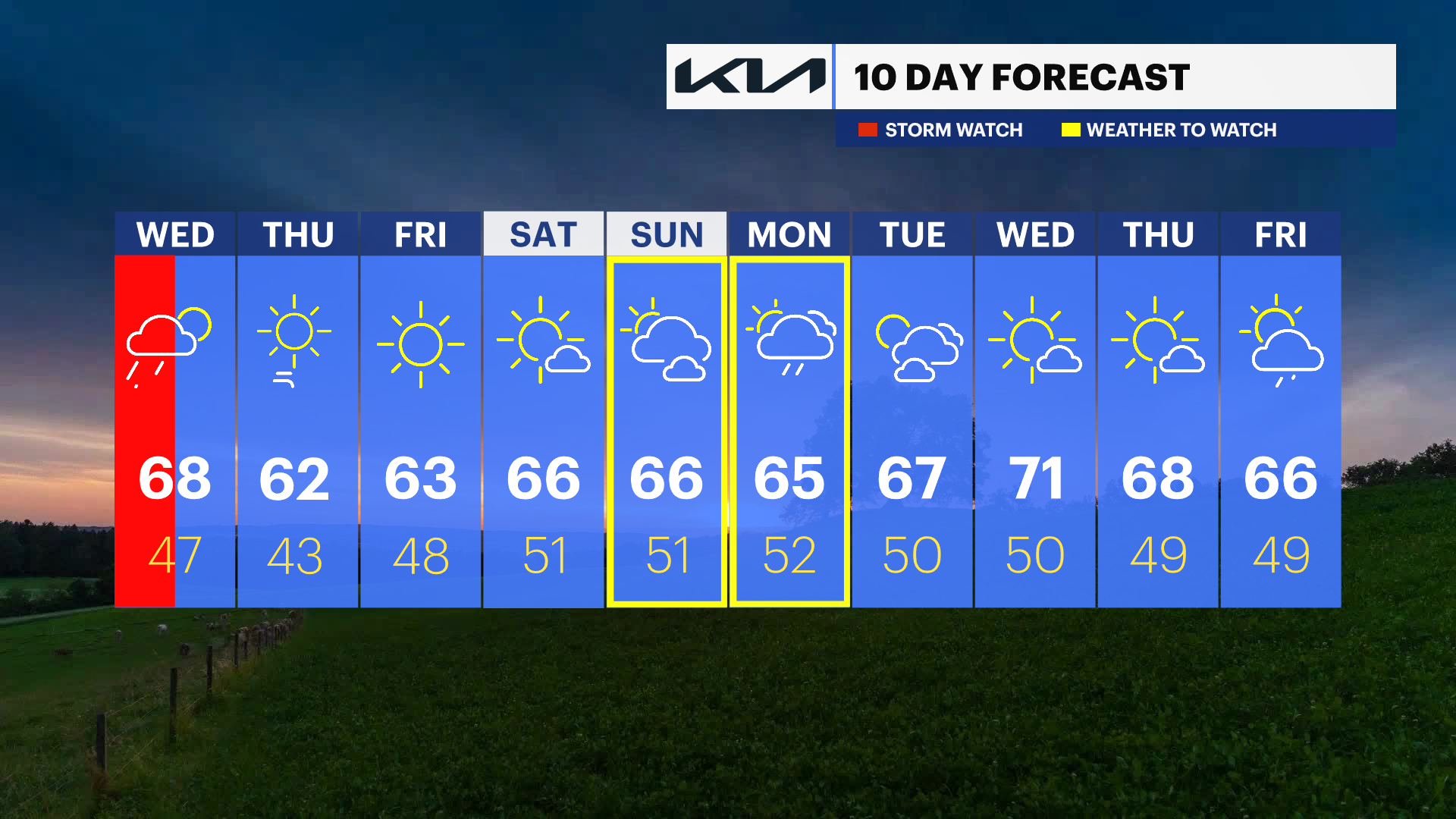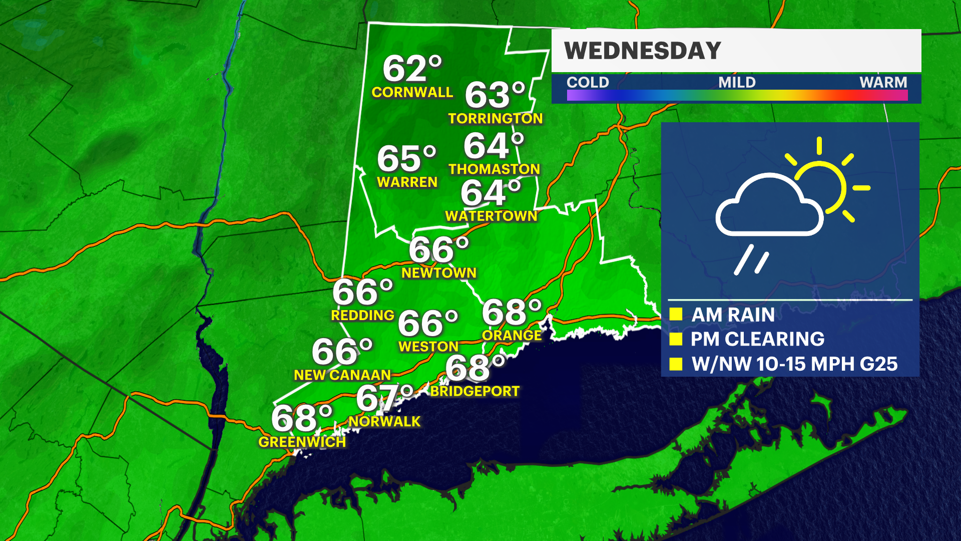 WEDNESDAY: Early rain, breezy then clearing. High of 68.