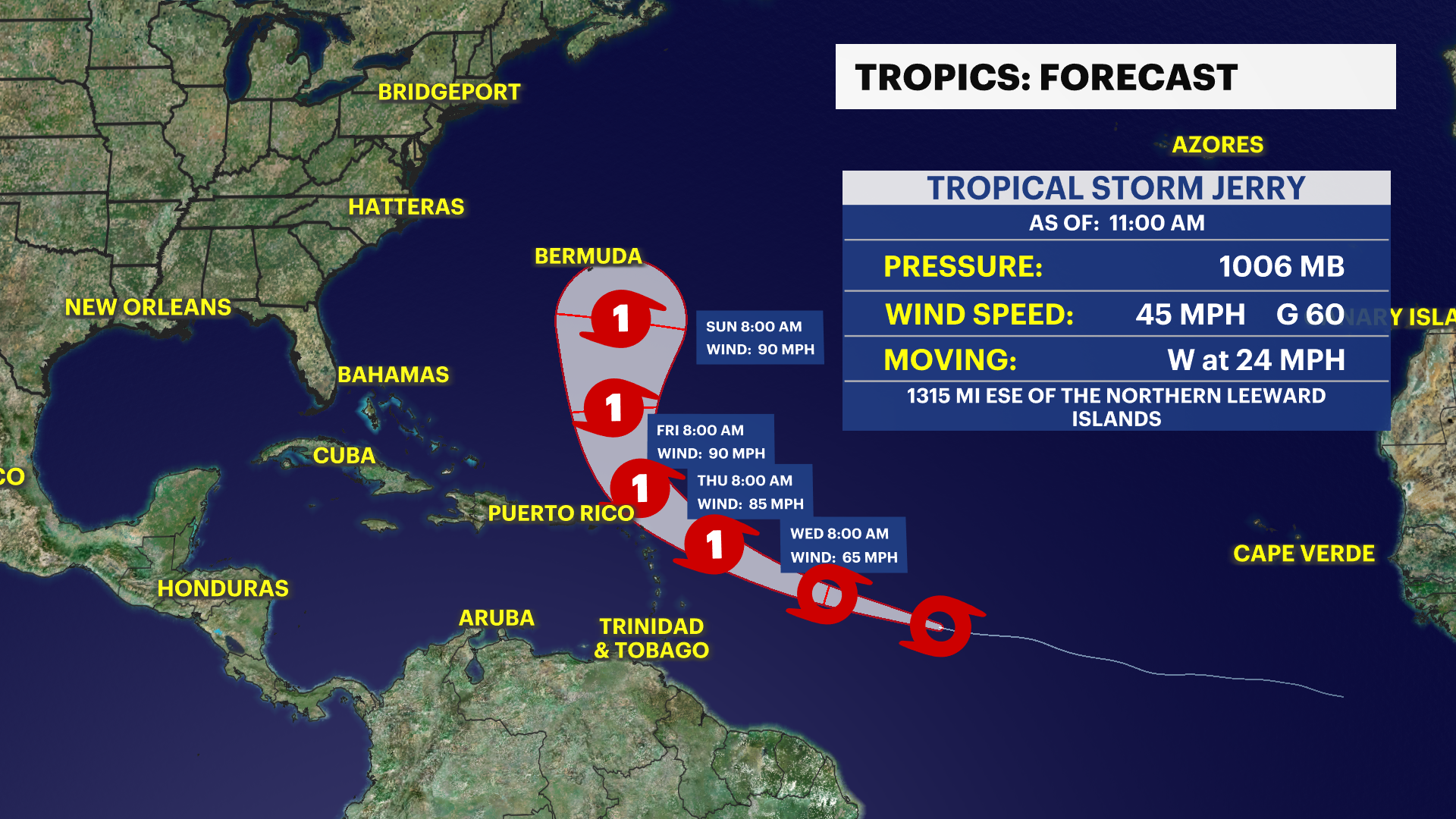 There is a new tropical storm in the Central Atlantic. Jerry is forecasted to become a hurricane by Thursday. The current forecast track keeps Jerry away from the U.S.