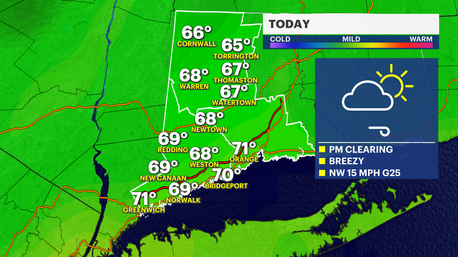 Today: Morning showers, then some sun later in the day. Morning high near 70, then in the 60s later in the day. Breezy with wind gusts around 25 mph for much of the day.