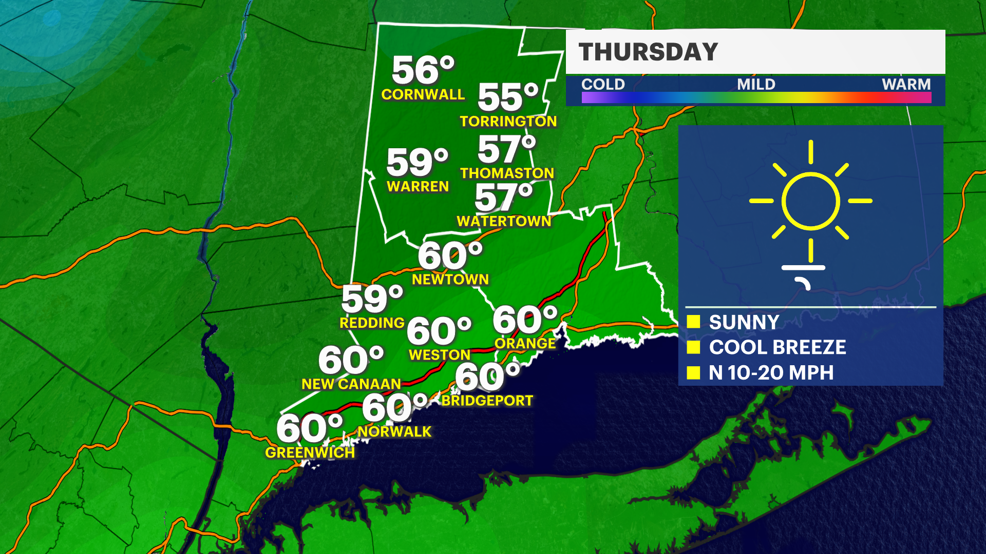 Thursday: Sunny with a chilly breeze. Highs around 60 with winds at times gusting over 20 mph.